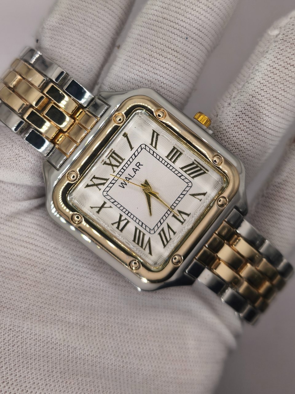 معرفی ست ساعت مچی زنانه و مردانه والار WALAR با طراحی خاص و جذاب کارتیر و صفحه مربعی که استایل شما را به سطح بالایی میرساند این ست با بند استیل آبکاری عالییییی، ضد آب و موتور کوارتز با دقت و دوام بی نظیر ساخته شده است، قفل پروانه
