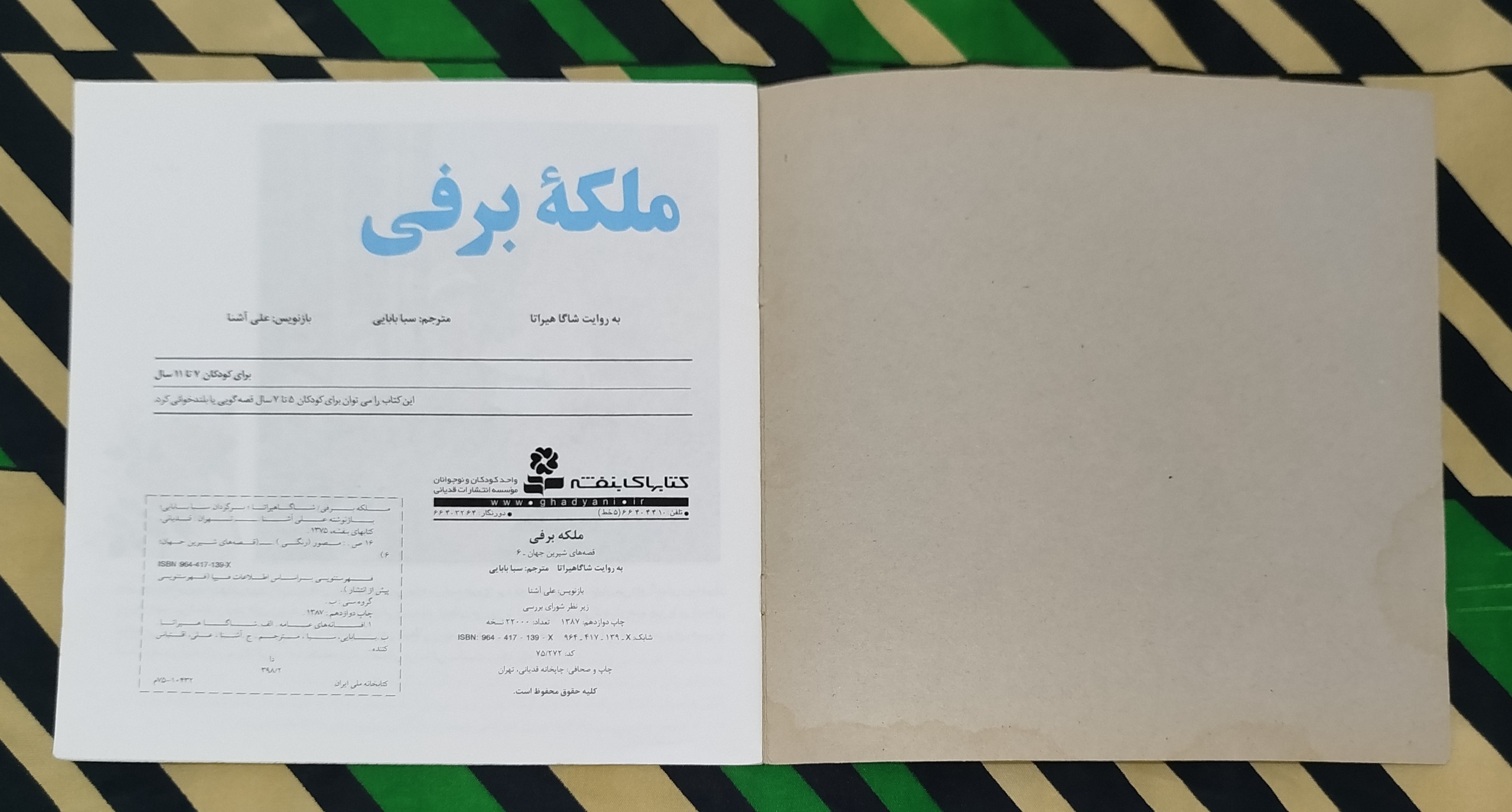 کتاب خاطره انگیز ملکهٔ برفی از سری کتابهای بنفشه انتشارات قدیانی چاپ دوازدهم 1387 تعداد صفحات 16 و صفحات کامل است.داخل جلد لکه دارد که عکس گذاشته ام .