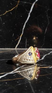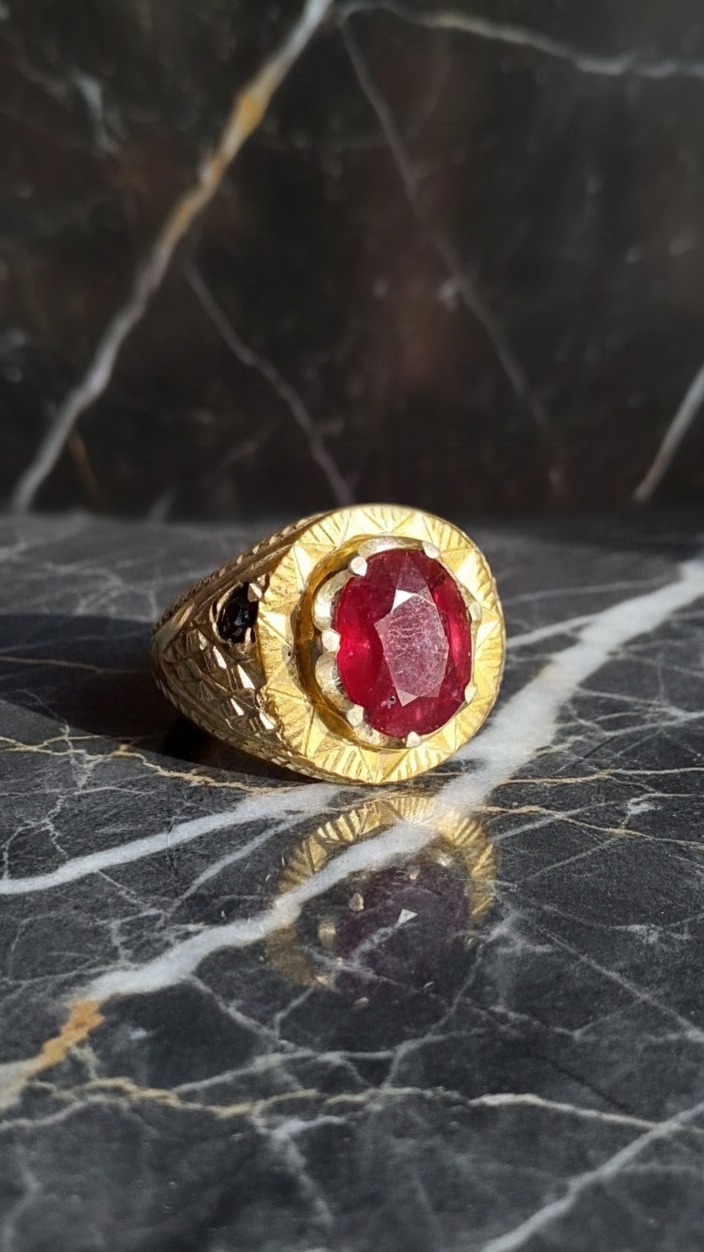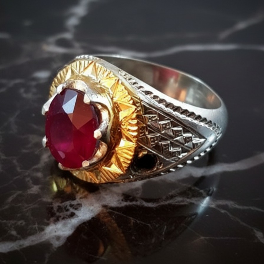 این انگشتر نقره لوکس مردانه با بدنهی نقره عیار 925 و طراحی کاملاً دستساز، با حضور یاقوت قرمز اصل در برش بیضی برلیان و وزن چشمگیر 49.45 قیراط، جلوهای خیرهکننده و سلطنتی ایجاد میکند. مخراجکاری هنرمندانه همراه با دو یاقوت کبود جانبی، ارزش و زیبایی انگشتر را دوچندان کرده و آن را به انتخابی متمایز برای آقایانی تبدیل میکند که به دنبال ظاهری قدرتمند، متفاوت و لوکس هستند.
