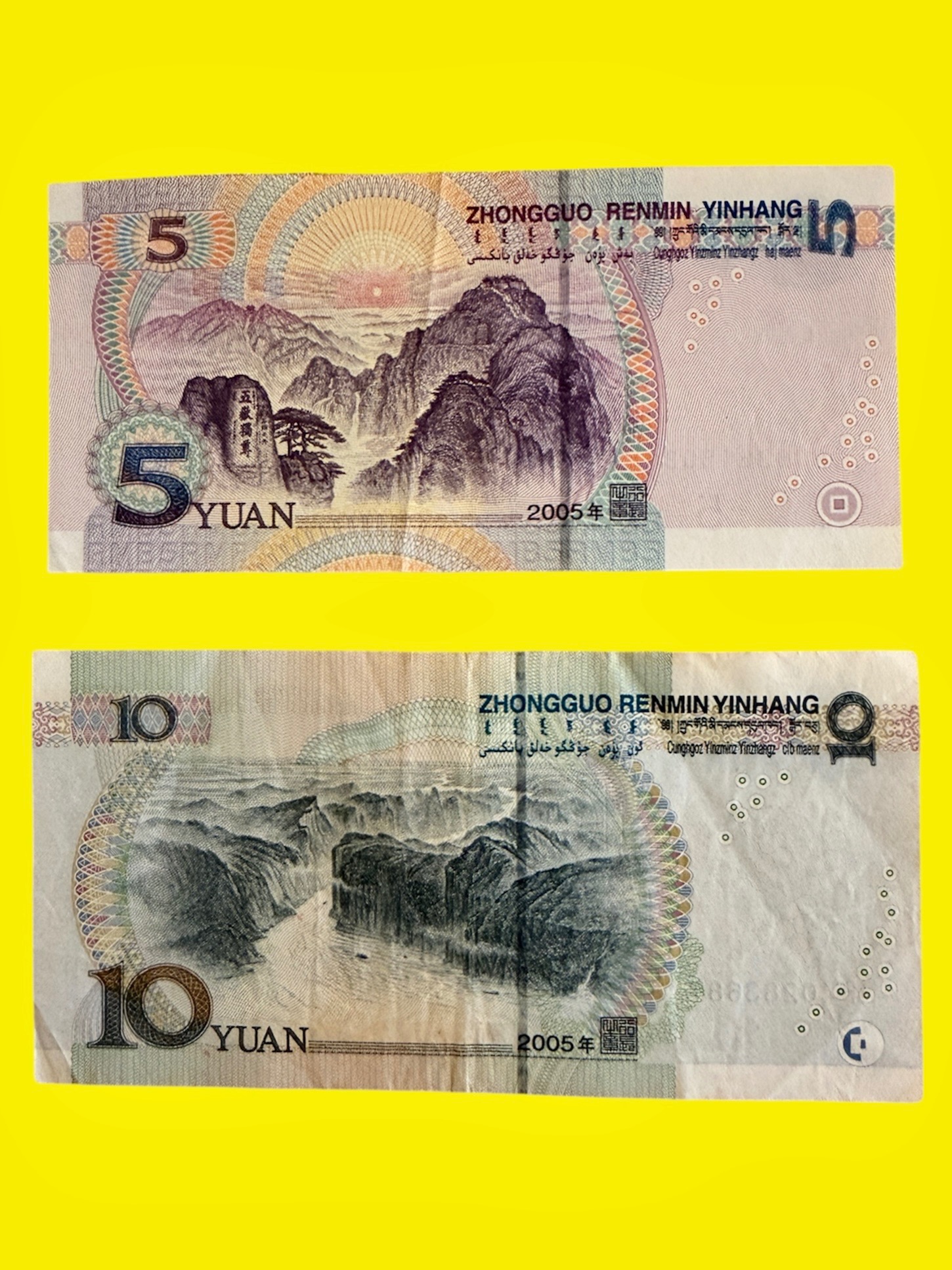 دو عدد اسکناس 5 و 10 یوان چین (دارای خط تا شدگی)