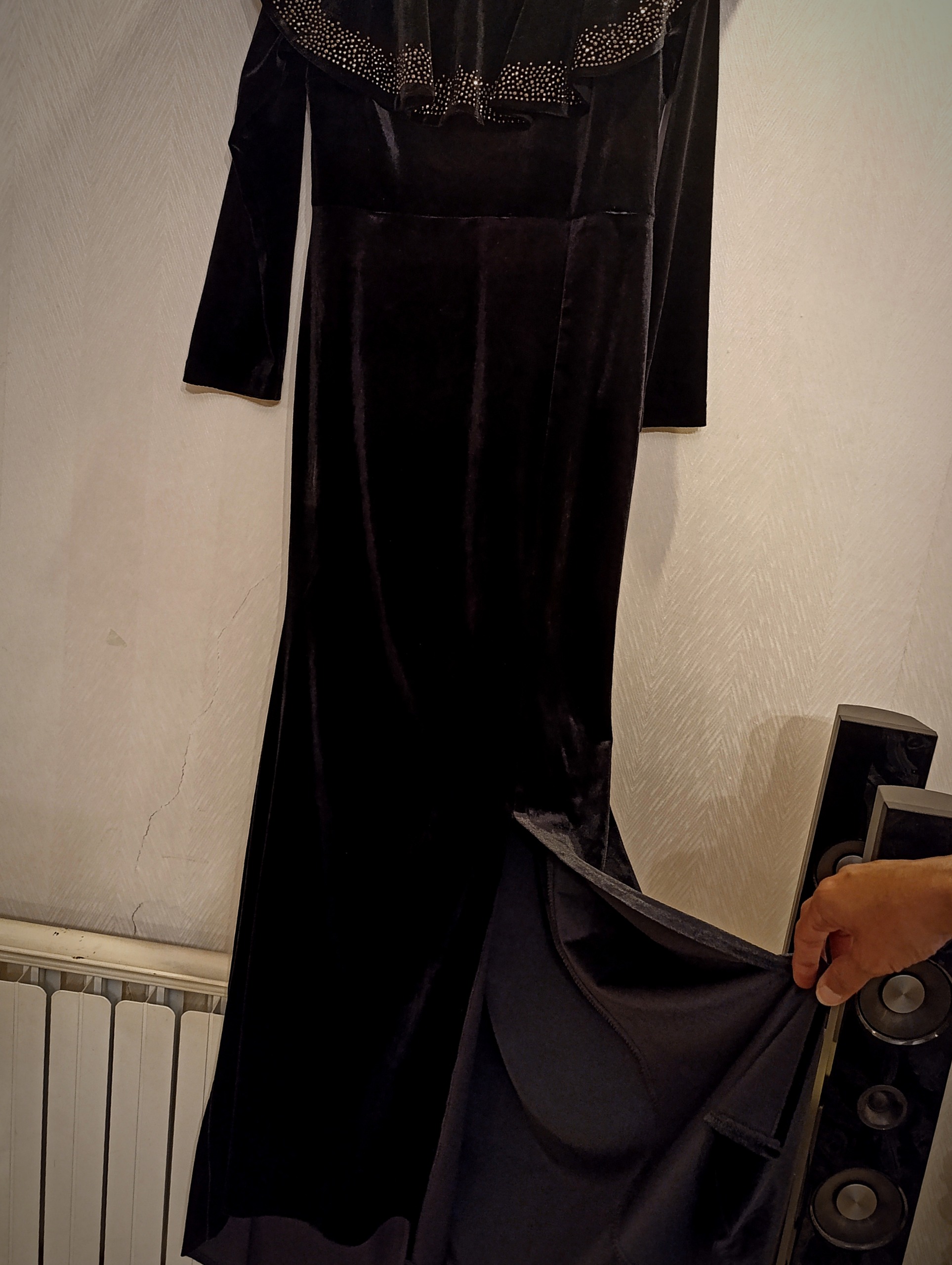 پیراهن ماکسی مخمل ، مناسب فصل ، پشت لباس از جلو بلندتره ، یه چاک بلند روی پای راست داره، آستر کشی تا سر چاک لباس، از پشت زیپ بلند داره ، پارچه کاملا کش میاد ،