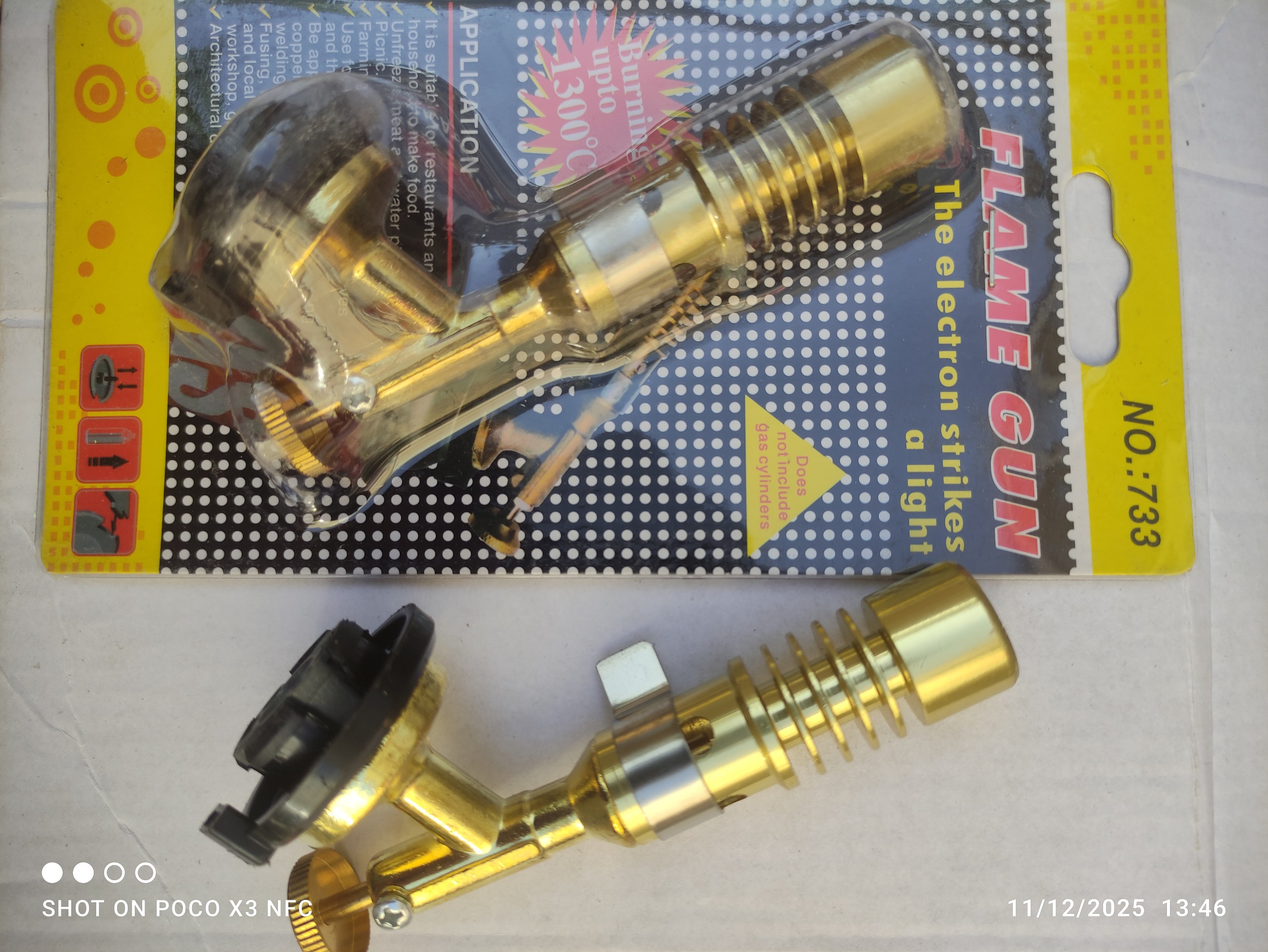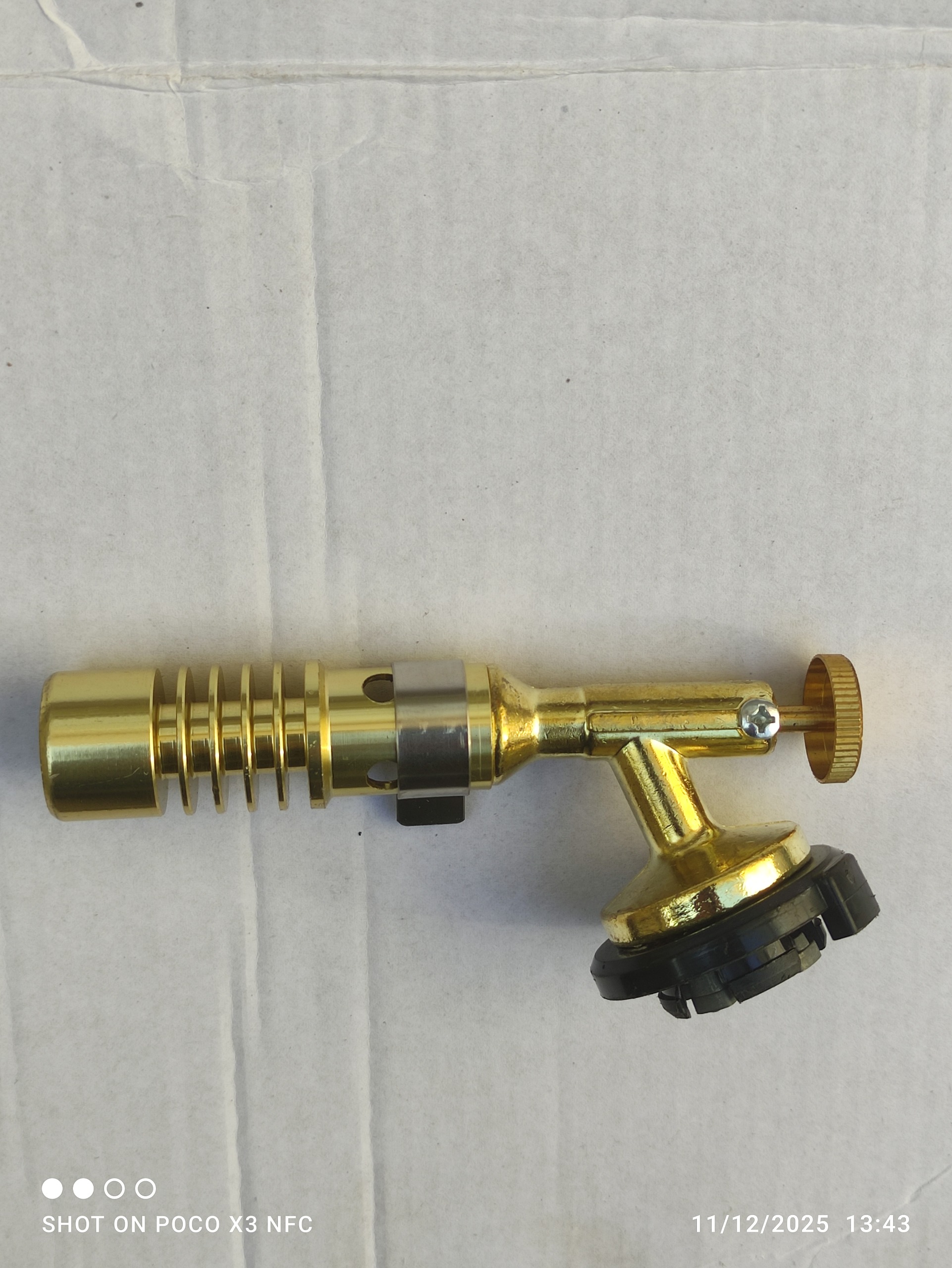 تورچ برنجی با حجمی کوچک مخصوص کپسول گاز و پیچ تنظیم شعله به همراه دستک برای تیز کردن شعله و متمرکز کردن آتش برای کار دقیق مناسب طلا سازها و رزین کارها و کارگاههای ظریف کاری استفاده در کوه و صحرا و برای هر شخصی نیاز هست