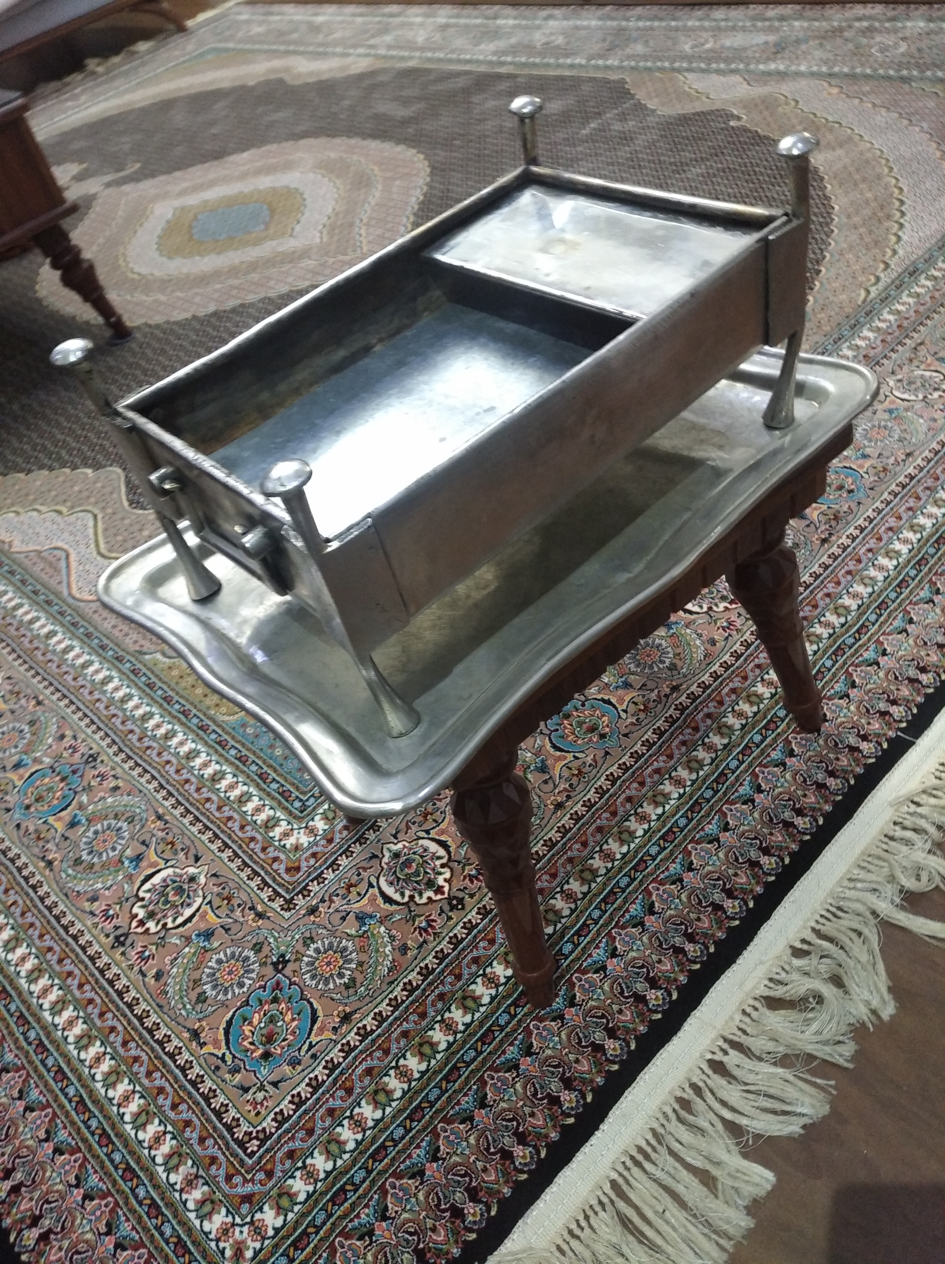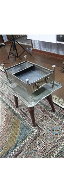 منقل برنجی با روکش آبکروم قدیمی دارای جای قوری با ابعاد 24 در 32 سانت با پایه و دسته زیبا بهمراه سینی ورشو سنگین و جوندار قدیمی کاملا سالم