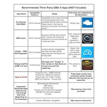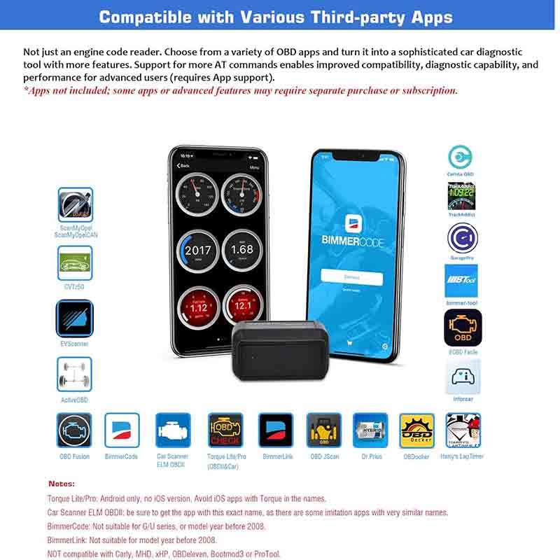 سازگاری با برنامهها: سازگاری با برنامههای شخص ثالث از جمله Car Scanner، OBD Fusion، Torque (Android)، BimmerCode*، BimmerLink*، OBD JScan، Dr. Prius و غیره. توجه: برنامهها شامل نمیشوند؛ برخی از برنامه ها یا ویژگی ها نیاز به خرید بیشتر دارند. (*سازگاری دقیق