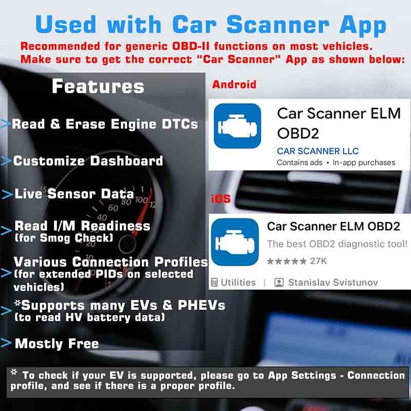 سازگاری با خودرو: با اکثر خودروها و کمپینهای سبک سازگار با OBD-II مدل 1996 به بالا در ایالات متحده آمریکا میکند؛ پشتیبانی از خودروهای برقی بر اساس مدل متفاوت است - قبل از خرید، برنامه Car Scanner را بررسی کنید یا با ما تماس بگیرید.
