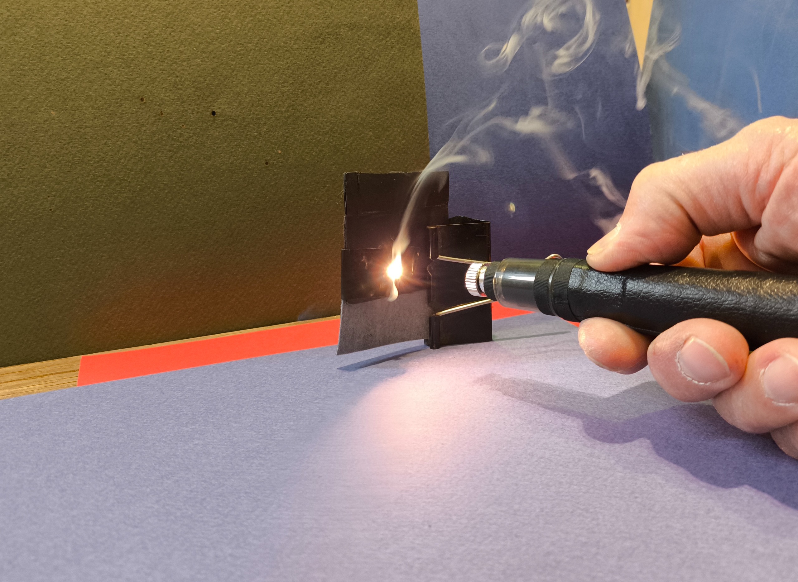 فاقد باتری داخلی میباشد ، این دستگاه در کارگاه « ایران تکنیک » اولین کارگاه ساخت و مونتاژ لیزرهای حرارتی و تورچ های فرابنفش در ایران و برگزیده نخبگان ایران 1394 ، بصورت دست ساز مونتاژ شده ، اما کیفیت کاملا مناسبی دارد . اسکلت قلم لیزر ورق فلزی و رویه با چرم
