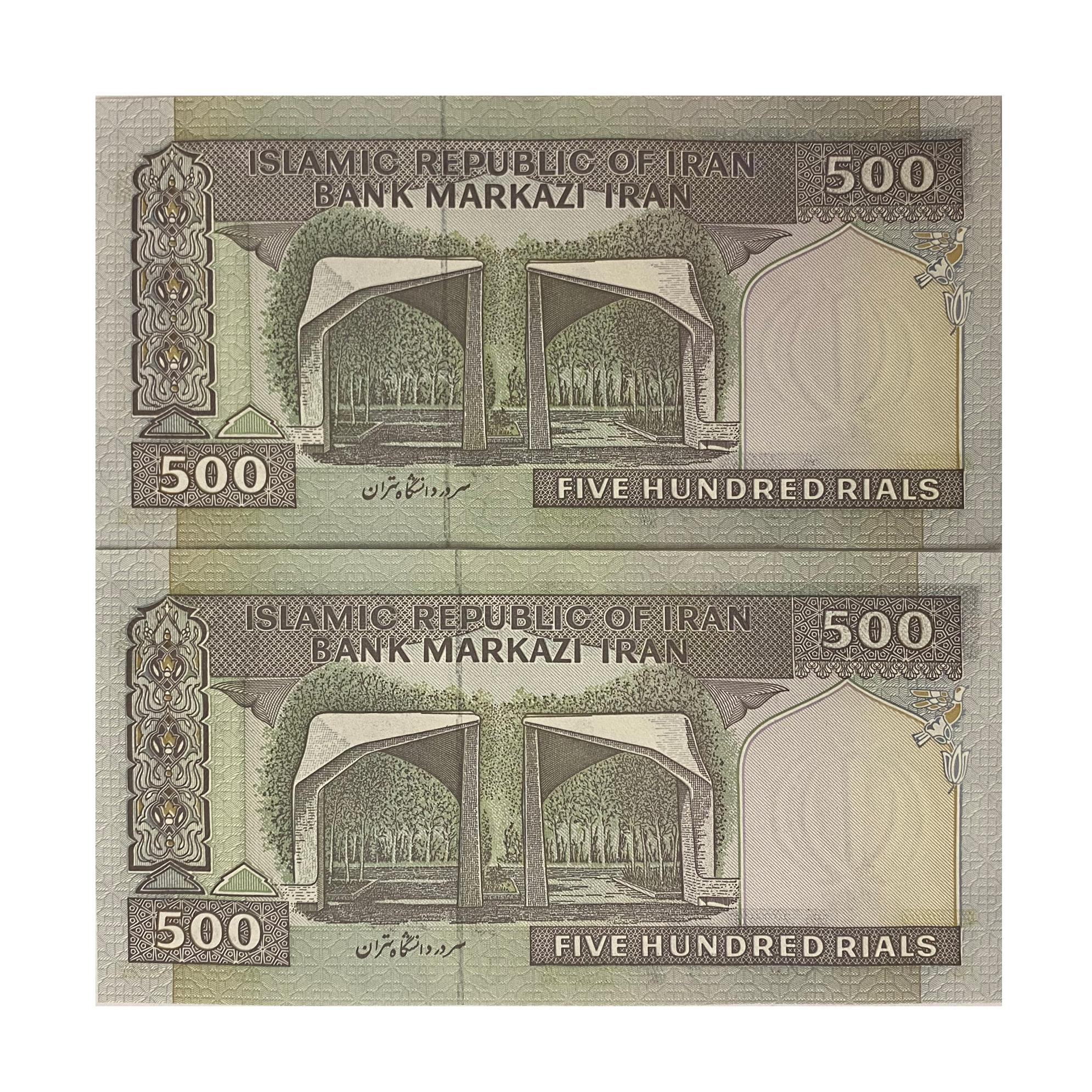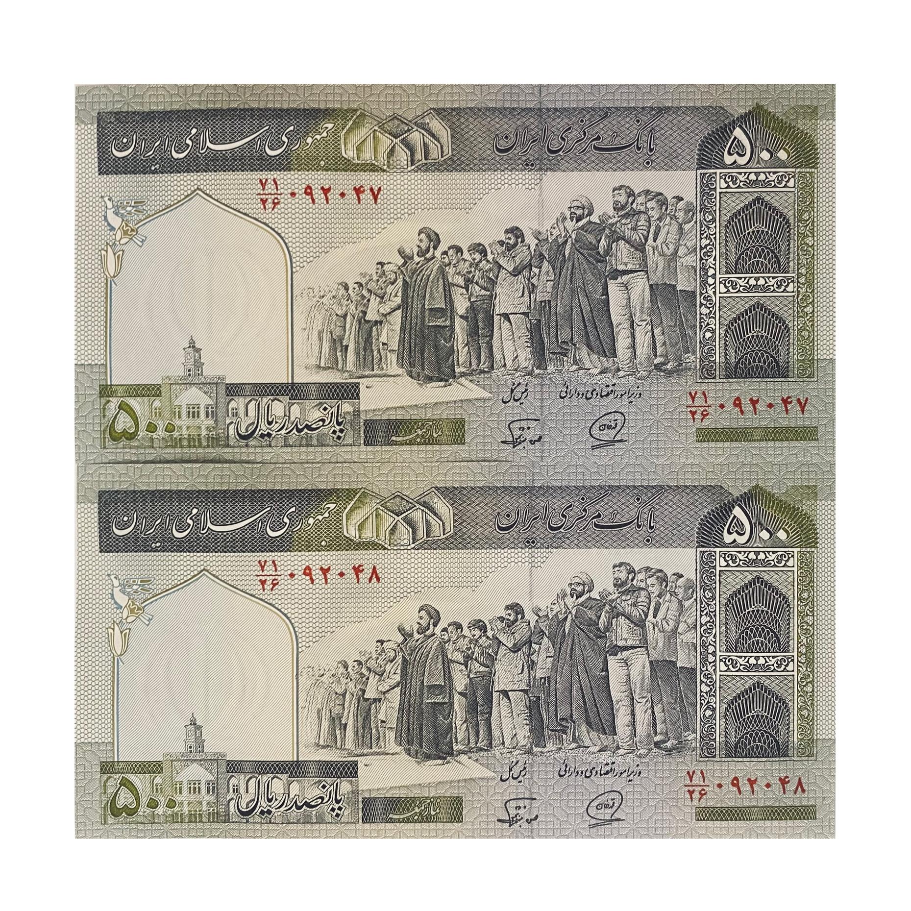 یک جفت اسکناس 500 ریالی امضای محمدخان و نوربخش، فیلیگران کمیاب آرم جمهوری اسلامی، کیفیت بانکی و نو، شماره عین تصویر