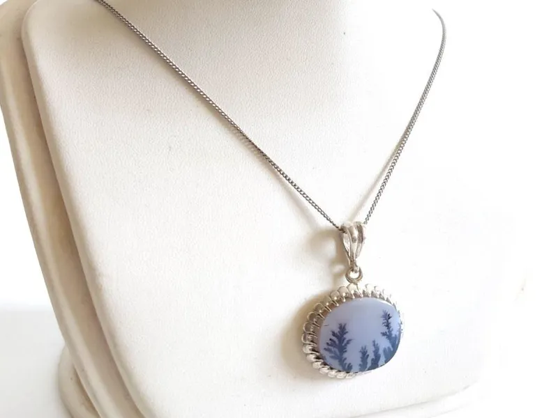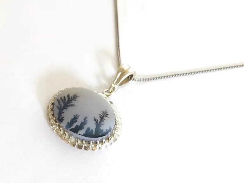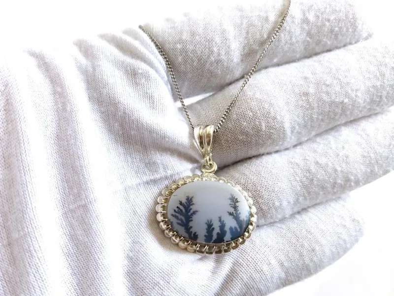 گردنبند عقیق شجر قائن بینظیر با قاب نقره 925