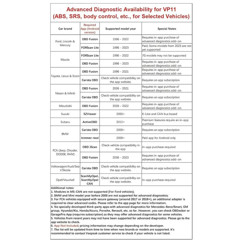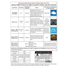 برای دستیابی به ویژگی های فوق به یک برنامه OBD شخص ثالث اندروید نیاز دارد (برخی از برنامه ها پولی هستند یا برای ویژگی های نیاز به خرید درونبرنامه دارند). سازگار با Torque Lite/Pro، OBD Fusion، Car Scanner ELM OBD2 و Infocar. با برنامه های Bluedriver، FIXD،