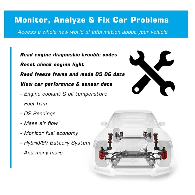 توجه: تشخیص پیشرفته (مانند ABS، S) و خوانش خاص سازنده (مانند سنسورهای همهگیرگیربکس) برای همه خودروهای OBD II در دسترس نیست.