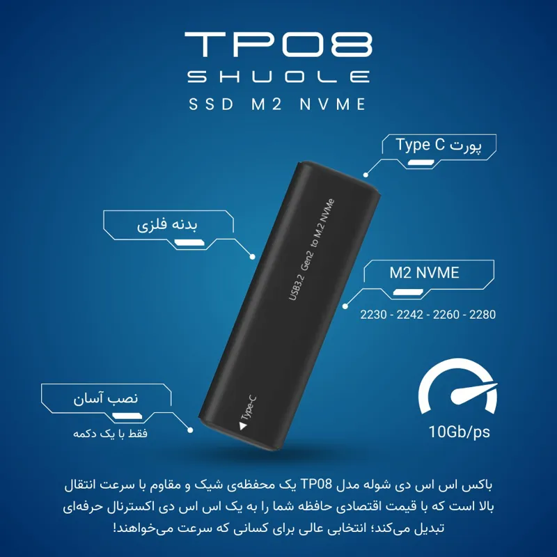 باکس SSD M2 مدل TP08 از برند شوله یک محصول شگفت انگیز و اقتصادی که تولید شده با آخرین تکنولوژی روز دنیا که با قیمت مناسب خود باعث شده تا بتوانید بر روی انواع اساسدی خود نصب و استفاده کنید این محصول با طراحی بسیار زیبا و مقاوم انواع اساسدی M2 NVME با سایز های 2230، 2242، 2260، 2280 را پشتیبانی میکند.