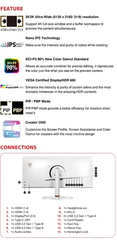 برخی از امکانات رو مینویسم بقیه رو توی گوگل سرچ کنید : سایز 34 اینچ - رزولیشن : 5120*2160 واقـعــی: 1200:1, داینامیک: 100000000:1 رنگ 1.07 بیلیون esam 8bits + FRC رصد پوشش فضای sRGB %100 درصد پوشش فضای DCI-P3 %98 HDR 600 esam VESA Certified HDMI 2× esam HDMI2.0 برای 4k DisplayPort برای 5k 1× esam DP1.4 برای 5k Type C برای 5k
