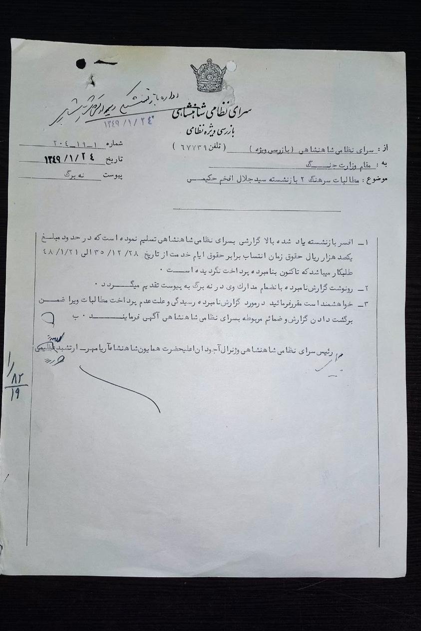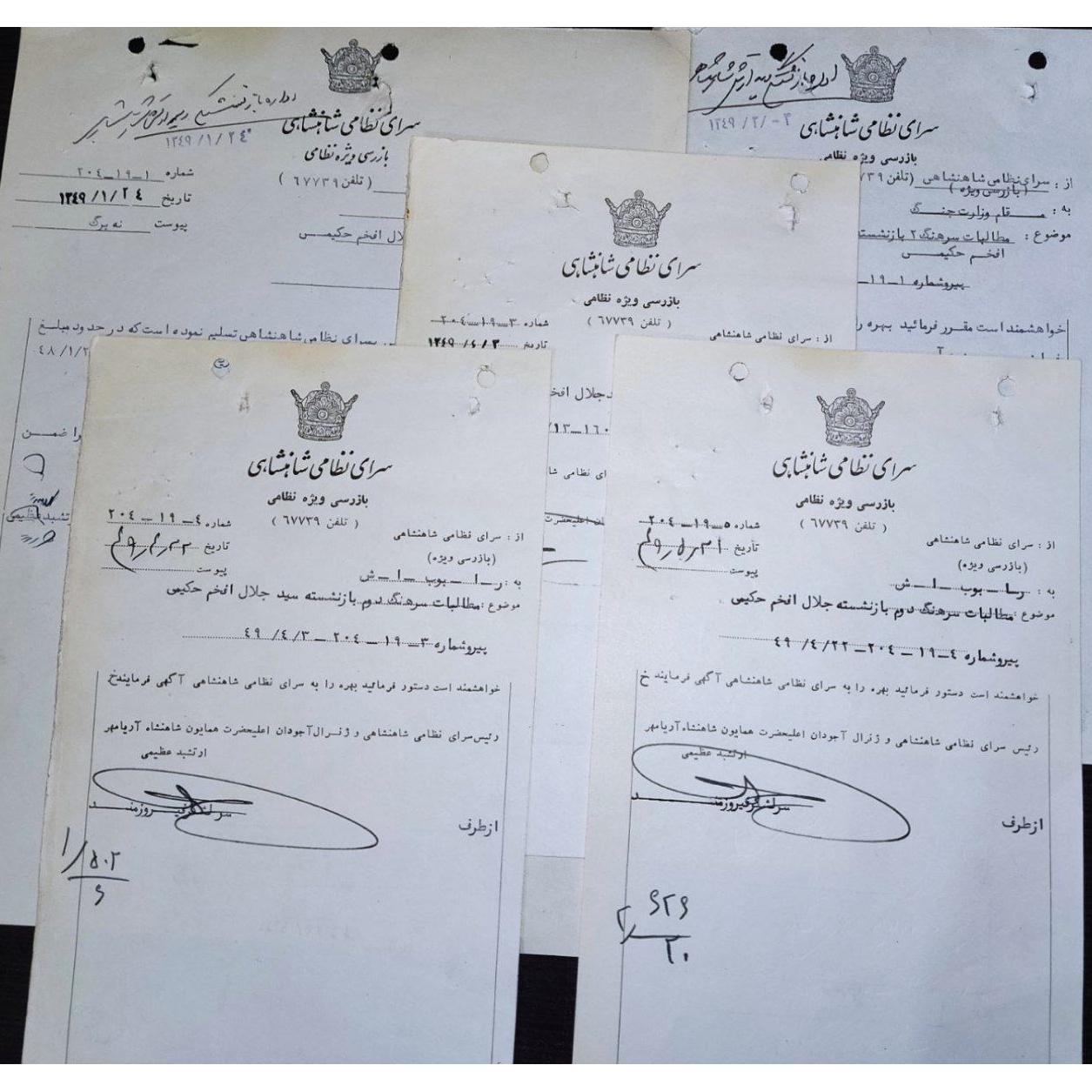 پنج برگ اوراق سرای نظامی شاهنشاهی، کلکسیونی و ارزشمندبا امضای رییس سرای نظام شاهنشاهی و ژنرال آجودان اعلیحضرت همایون شاهنشاه پهلوی، ارتشبد عظیمی و....