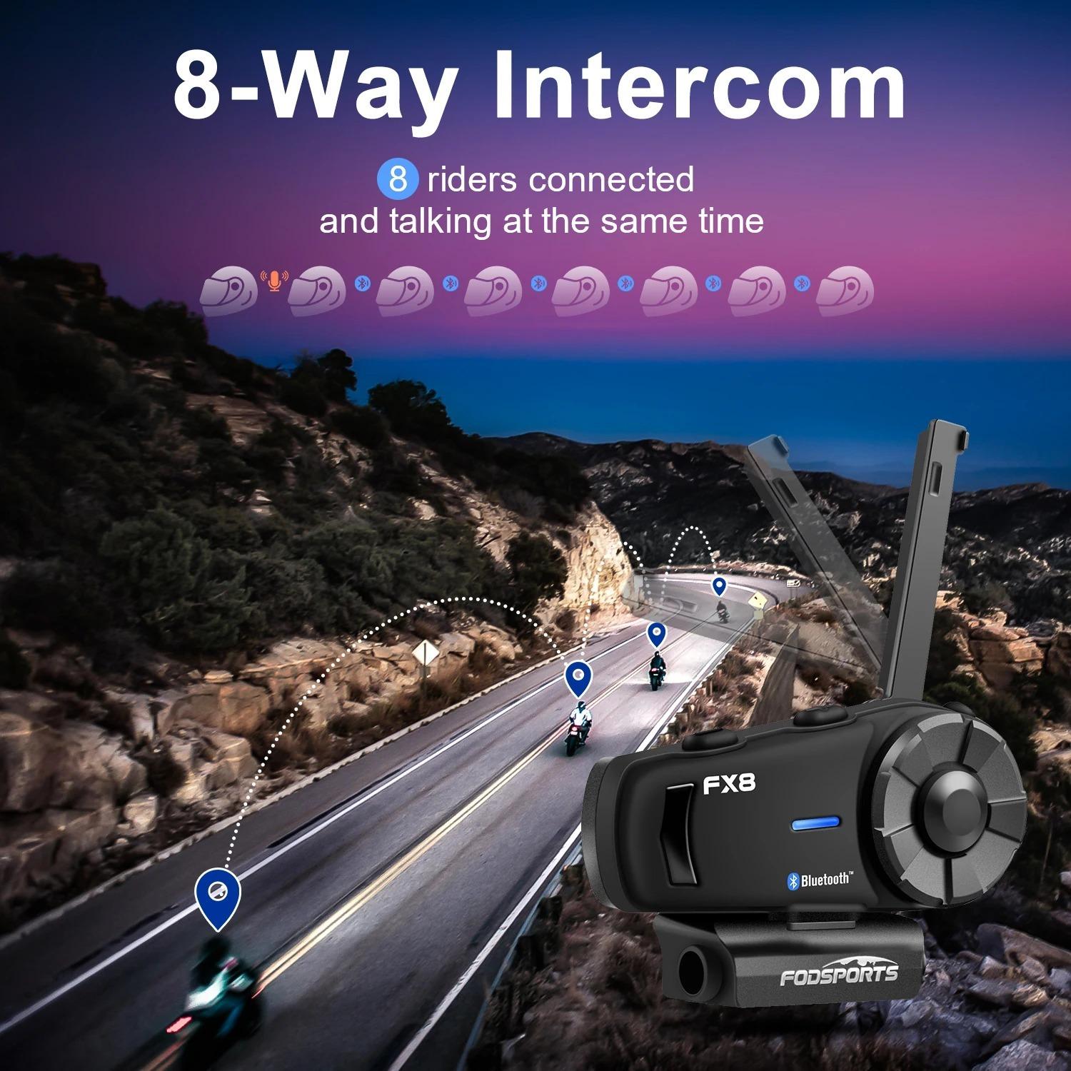 سیستم ارتباط داخلی بلوتوث موتورسیکلت FODSPORTS FX8 با قابلیت حذف نویز، هدست بلوتوث کلاه ایمنی با FM، سیستم ارتباط داخلی کلاه ایمنی تا 8 سرنشین (ضد آب/هندزفری/موسیقی استریو/GPS/1 عدد)