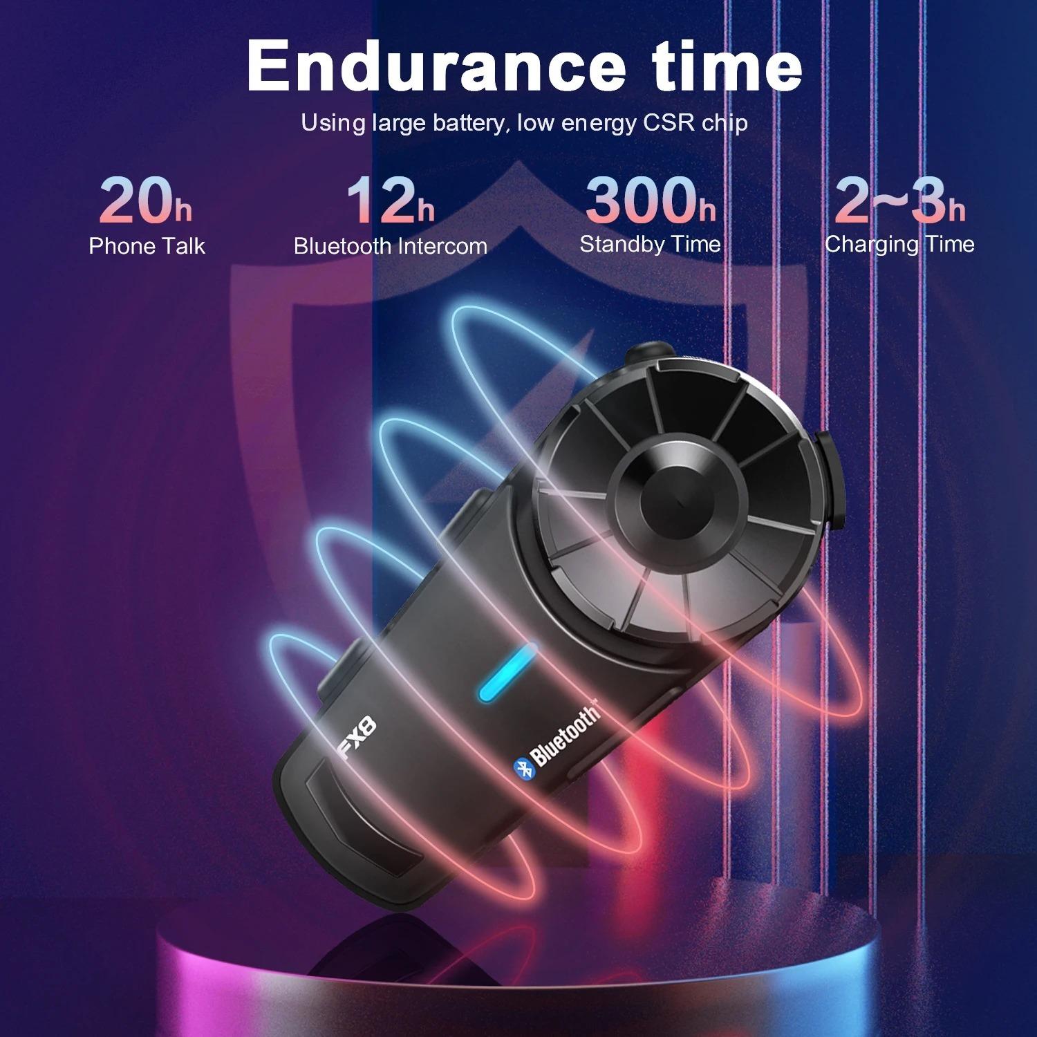 عمر طولانی باتری: ظرفیت باتری سیستم ارتباط داخلی کلاه ایمنی موتورسیکلت FX8، 900 میلیآمپر ساعت است که میتواند تا 20 ساعت مکالمه تلفنی، تا 15 ساعت ارتباط داخلی و تا 300 ساعت حالت آماده به کار را پشتیبانی کند، تنها 3 ساعت زمان شارژ. علاوه بر این، عملکرد یادآوری باتری، جزئیات شارژ هدست بلوتوث را در هر زمانی به شما اطلاع میدهد. بنابراین لازم نیست در طول کل سفر نگران کمبود باتری باشید. میتوانید تفریح خود را با دوستانتان به اشتراک بگذارید.