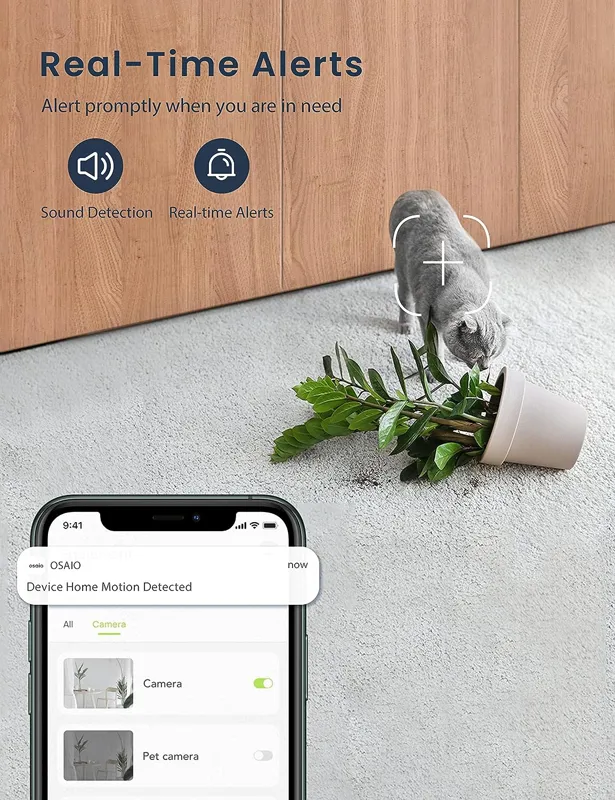 - تشخیص حرکت/صدا و هشدار در زمان واقعیآژیر داخلی و حسگر حرکت/صدا،حرکت را دنبال و ضبط می کند و از طریق برنامه Osaio یک اعلان فوری به تلفن شما ارسال می کند