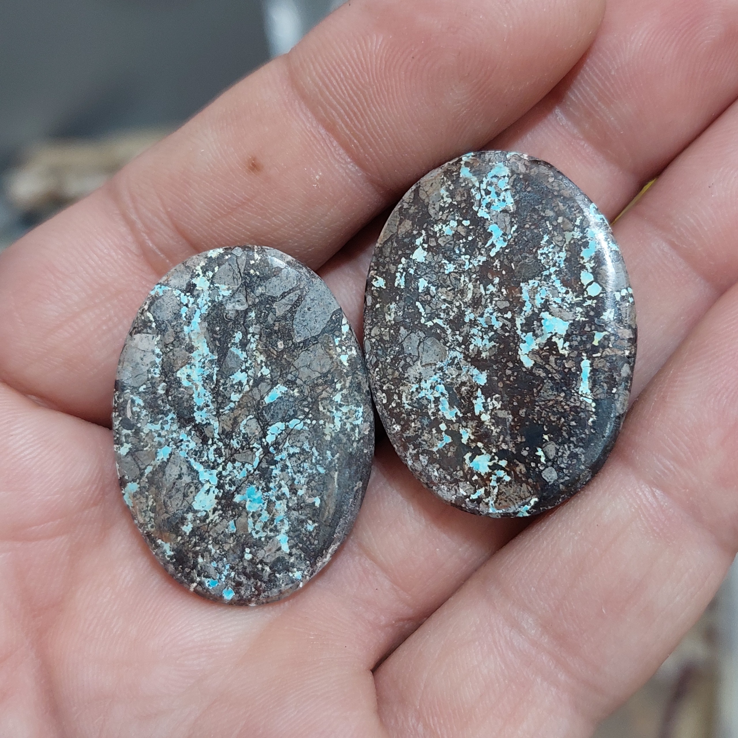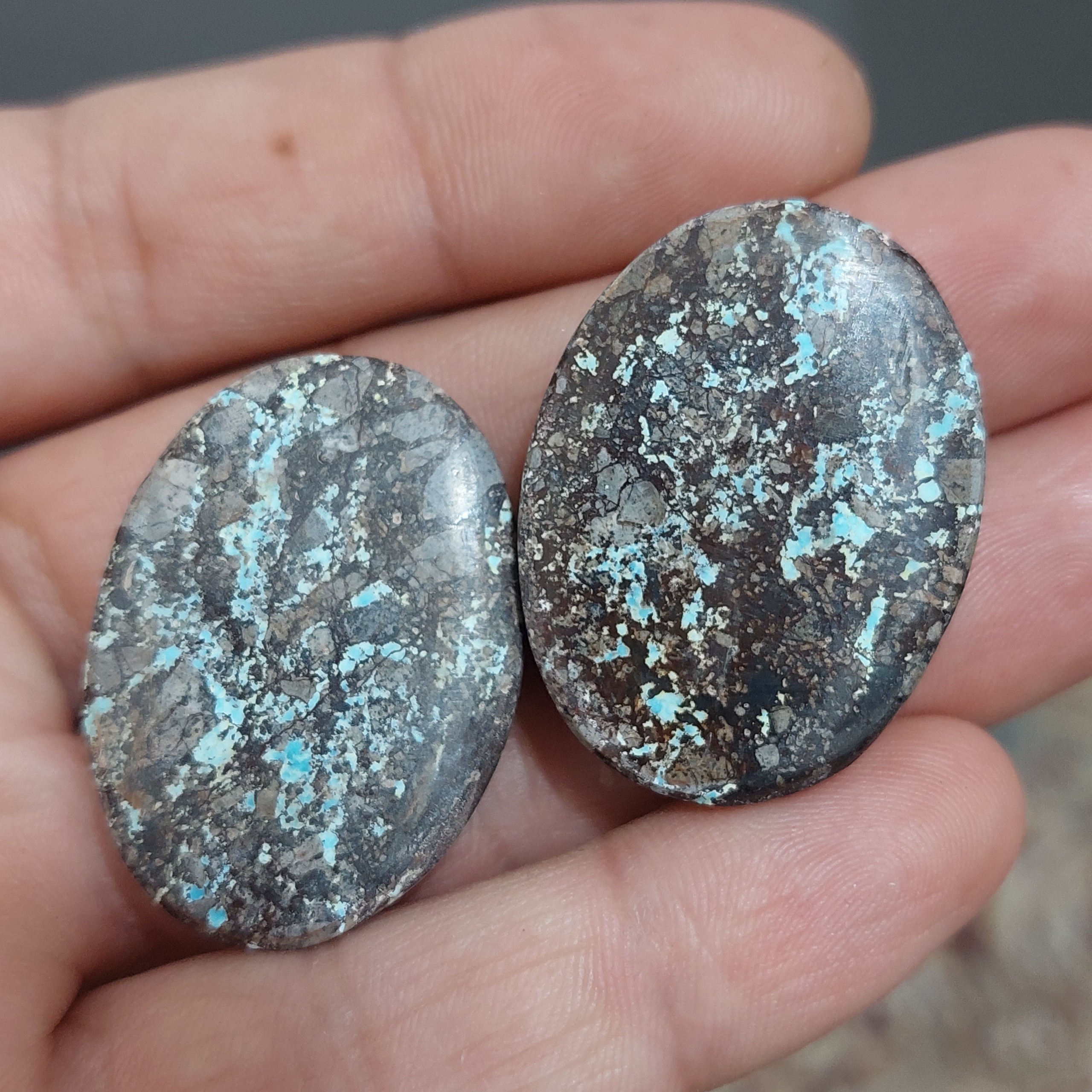 دو عدد نگین درشت سنگ فیروزه نیشابوری اصل سنگ سیاه چاهی فوق العاده خاص و زیبا ابعاد نگین ها 35 در 25 میلیمتری