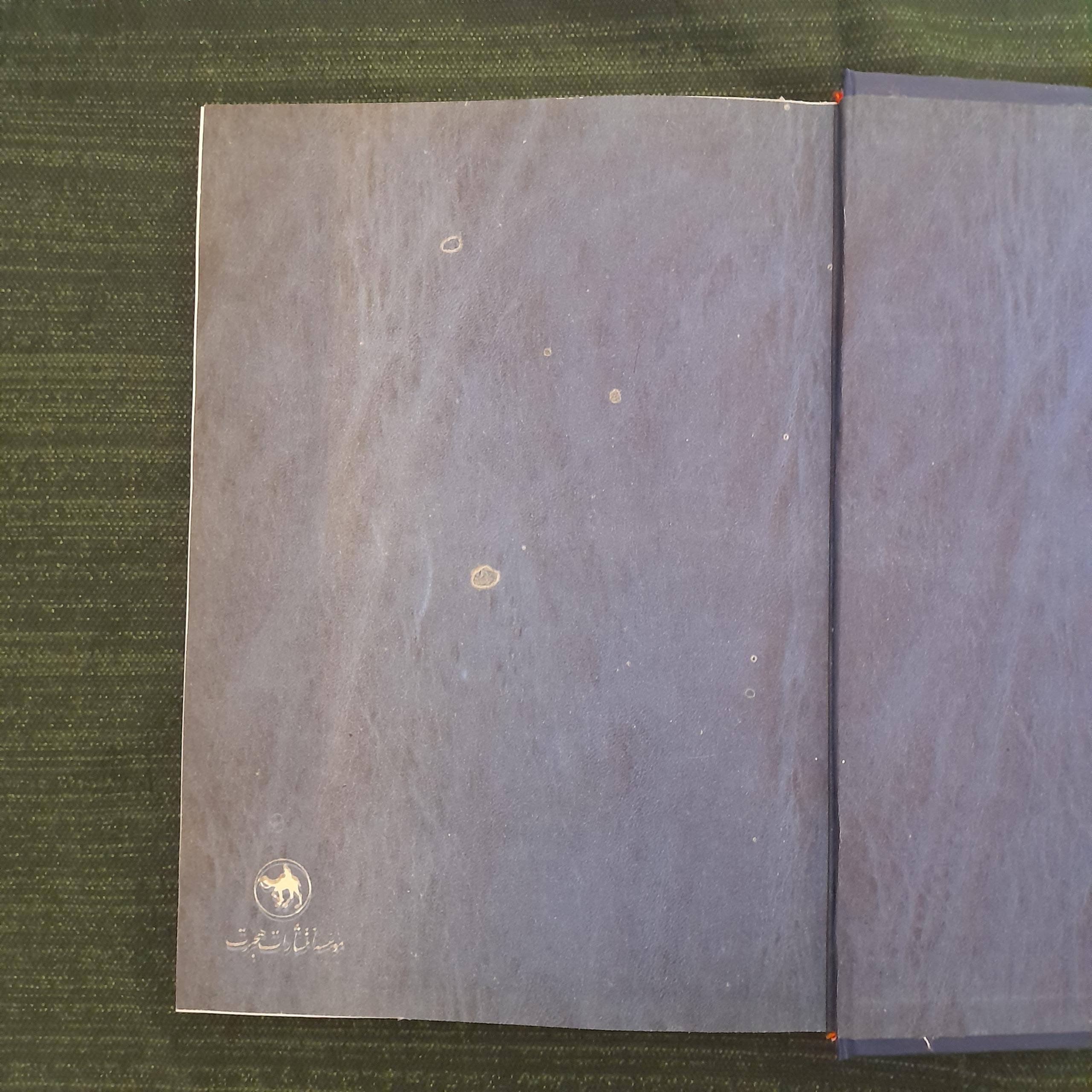 کاغذ پشت جلد که سرمه ای رنگ است از خود چاپخانه گاها لکه سفید دارد.
