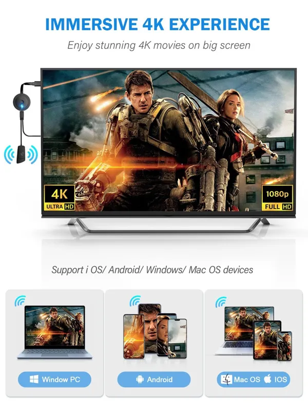 پخش صفحه نمایش کوچک به صفحه بزرگ: آداپتور بی سیم DARLYOR را می توان برای پخش ویدیو و صدای 4K HD از تلفن هوشمند، آی پد، مک بوک، تلفن های هوشمند اندرویدی، تبلت ها، لپ تاپ ها و رایانه های شخصی به صفحه نمایش های بزرگتر مانند تلویزیون، نمایشگر و پروژکتور استفاده