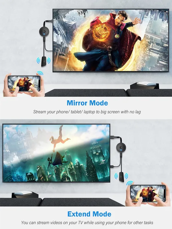 اتصال بیسیم و آسان کافی است دانگل را به تلویزیون خود وصل کنید، آن را روشن کنید و عملکرد آینهکاری را در دستگاه خود پیدا کنید تا پخش را شروع کنید. از ویدیو و صدای با کیفیت بالا از دستگاه خود به هر صفحه نمایشی لذت ببرید و HDMI خود را بی سیم می کند. (توجه: