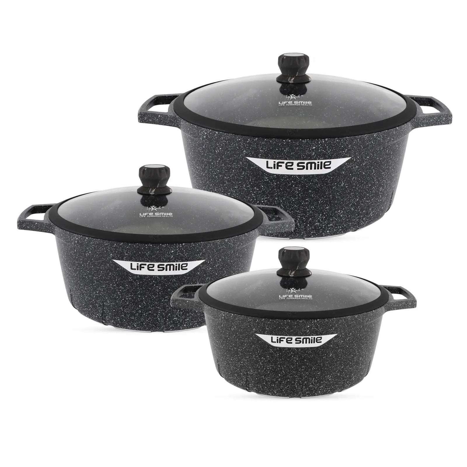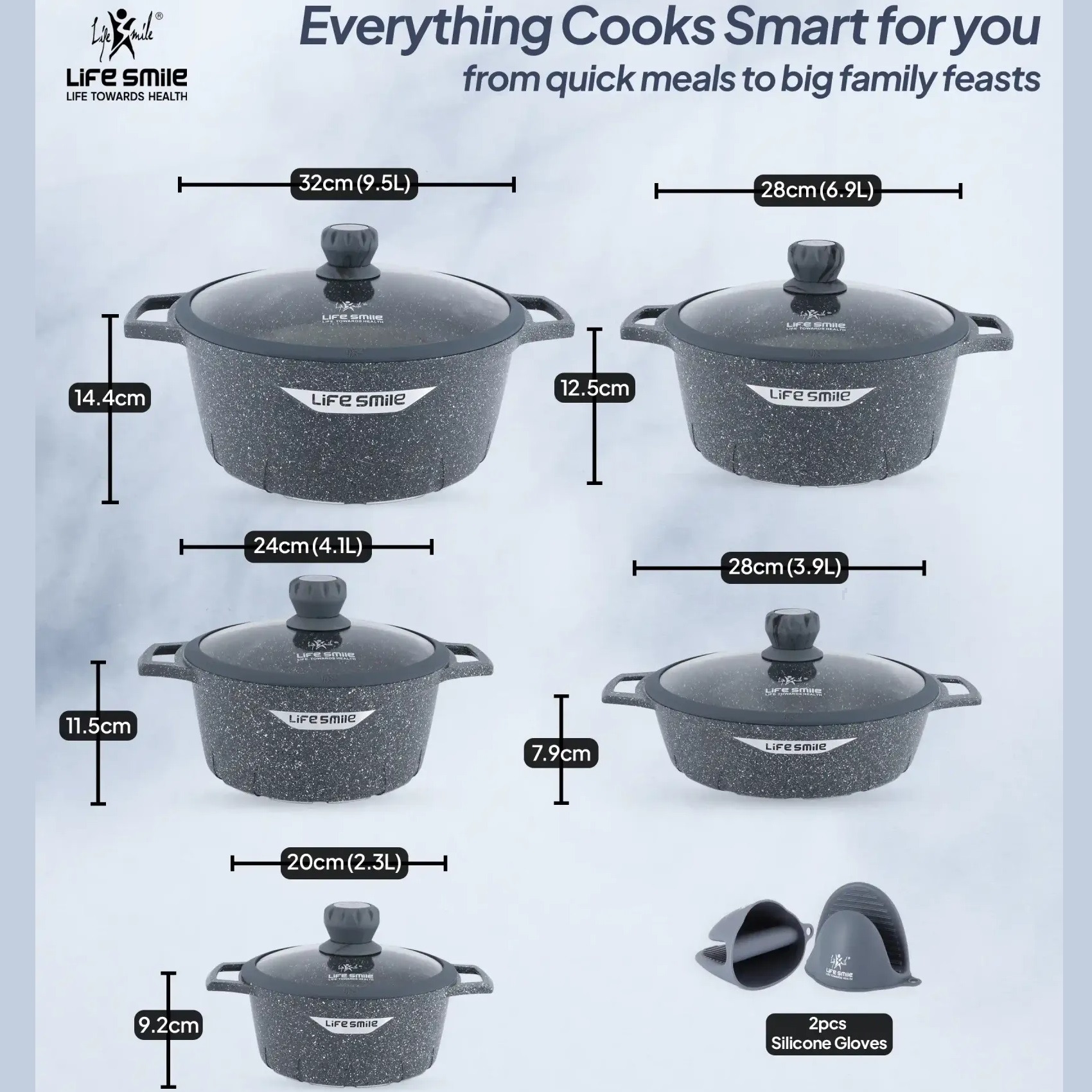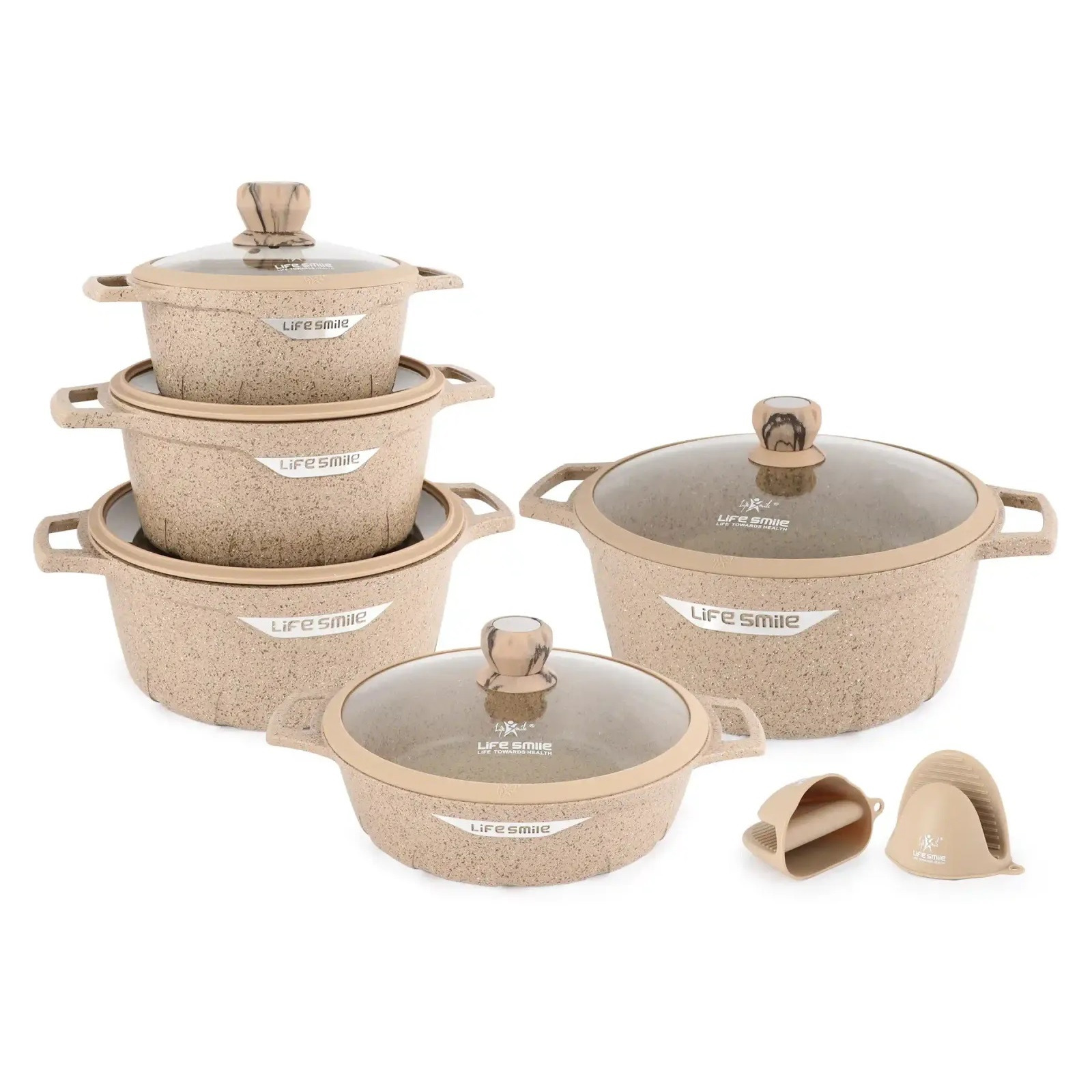 این سرویس یکی از جدید ترین سرویس های قابله از شرکت لایف اسمایل است که در سال 2025 تولید شده است. شرکت لایف اسمایل در این سرویس از فناوری های نوین و به روز دنیا جهت پخت بهتر غذا و حفظ سلامتی افراد استفاده کرده است. این سرویس دارای پوشش نچسب پیشرفته، عملکرد عالی را ارائه میدهد. همچنین این سرویس دارای دربهای شیشهای با لبههای سیلیکونی، دریچههای بخار و دستگیره ی درب از جنس باکالیت می باشد. کف قابلمه ها سازگار با اجاق القایی - روی همه اجاق گازها، از جمله اجاق القایی، کار میکند. داخل کارتن یک جفت دستکش مقاوم در برابر حرارت برای جابجایی ایمن قابلمه ها همانند تصویر وجود دارد. این سرویس از تکنولوژی گرمایش یکنواخت و کارامد (گرمای سریع و مداوم بدون نقاط داغ) استفاده می کند. سطح نچسب بادوام قابلمه ها برای استفاده بدون دردسر طراحی شده و برای تمیز شدن در مصرف آب صرفه جویی میکند. برای ماندگاری طولانی و حفظ کیفیت، شستشو با دست توصیه میشود. لایه بیرونی این سرویس مقاومت در برابر خراش افزایش یافته با نحوه استفاده توصیه شده و عاری از هرگونه مواد  PTFE/PFOA برای حفظ سلامتی مصرف کنندگان عزیز می باشد. این سرویس شامل: قابلمههای 20 سانتیمتری (2.3 لیتر)، 24 سانتیمتری (4.1 لیتر)، 28 سانتیمتری (6.9 لیتر)، 32 سانتیمتری (9.5 لیتر) و تابه 28 سانتیمتری (3.9 لیتر) و 2 عدد دستکش سیلیکونی می باشد.