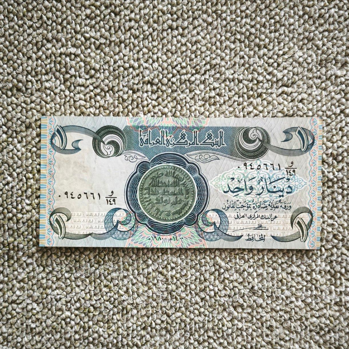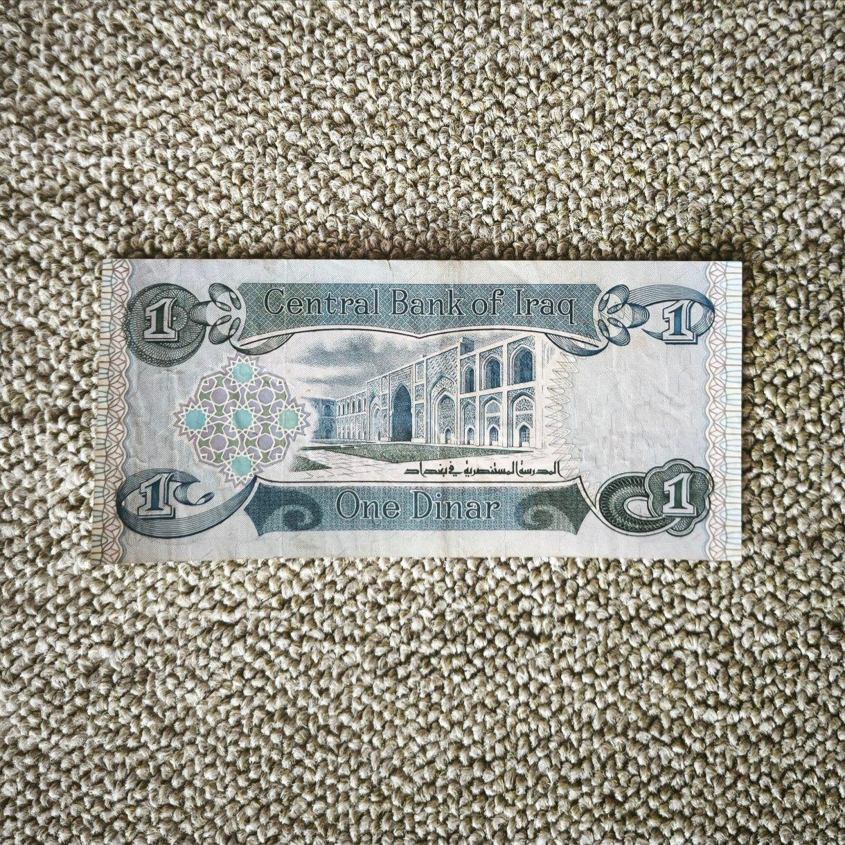 اسکناس یک دینار عراق سری 1979ـ1986 میلادی با تصویری از دینار طلای اسلامی روی اسکناس و مدرسه مستنصریه بغداد در پشت اسکناس، بدون پارگی یا خط خوردگی خودکار.