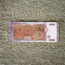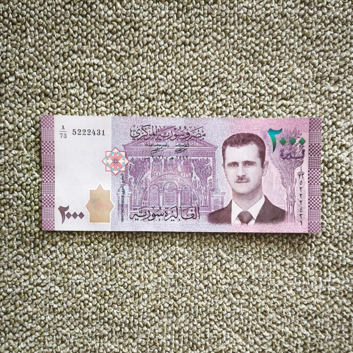 2000 لیر سوریه 2021 میلادی با تصویر بشار اسد، بسیار تمیز و صرفاً تای کیفی نامحسوس دارد.