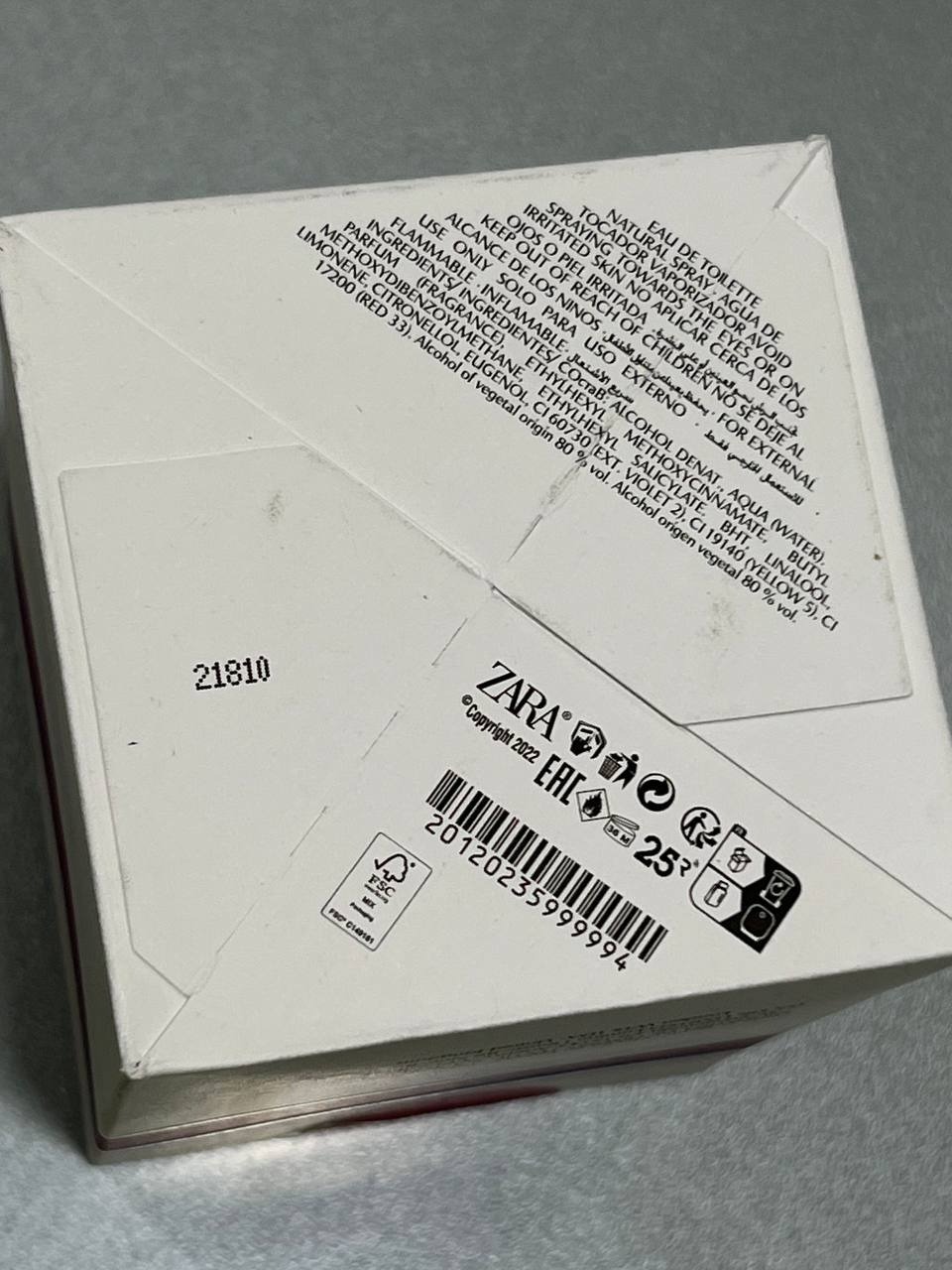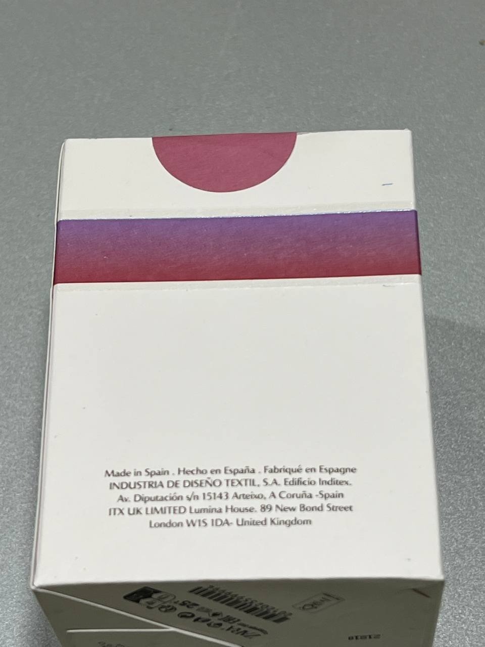 ساخت اسپانیا (Made in Spain): مهمترین نشانه اصالت، محل تولید است. همانطور که در تصویر پشت جعبه مشاهده میکنید، عبارت Made in Spain و Hecho en España به وضوح درج شده است. همچنین آدرس کارخانه اصلی زارا (Inditex) در شهر لاکرونیا (A Coruña) اسپانیا روی جعبه حک شده که مهر تاییدی بر مبدا اروپایی کالا است.