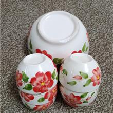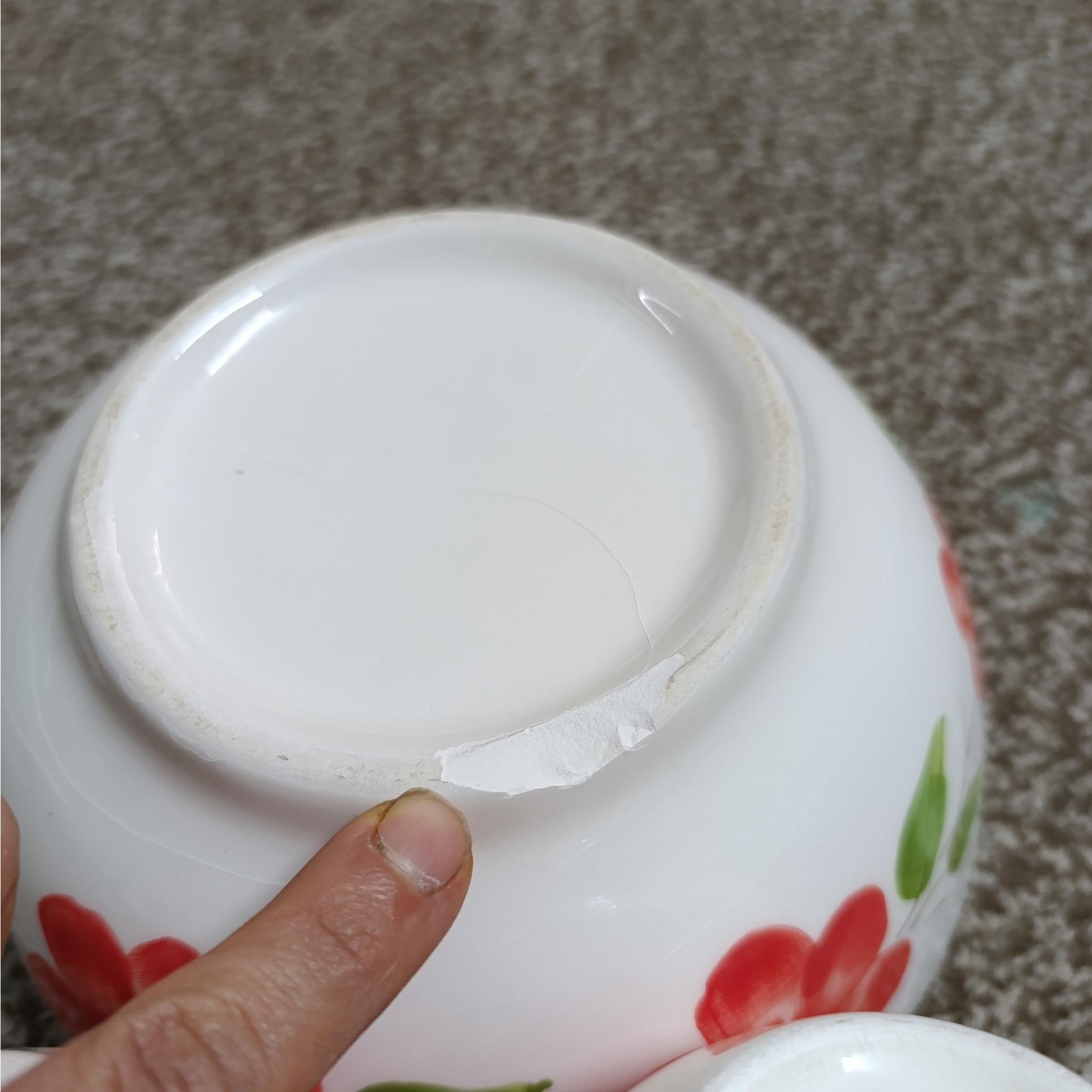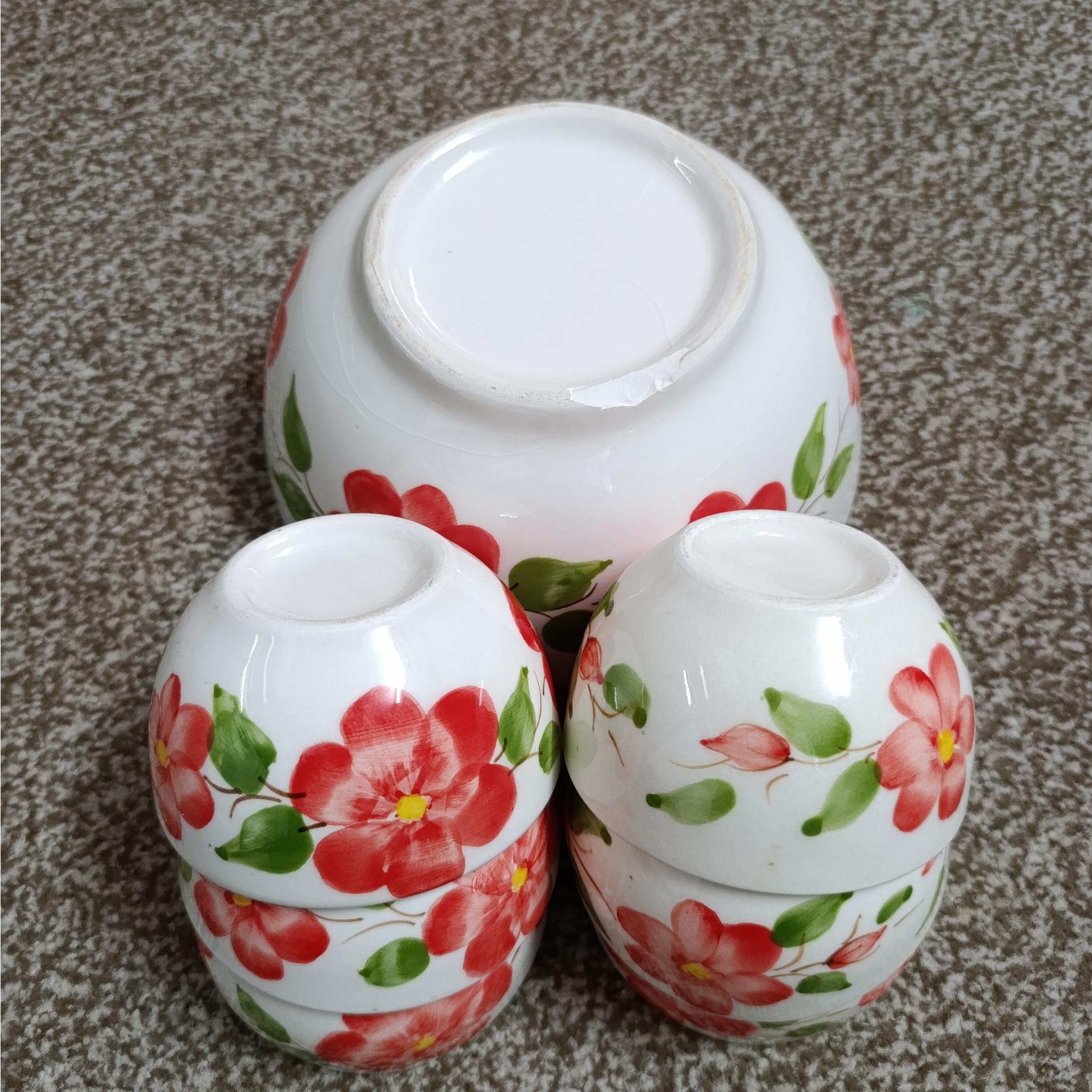 کاسه بزرگ داخلش کمی حالت ترک ترک داره و آب پریدگی بیرون رو هم نشون دادم و 6 عدد پیاله کوچک قطر 10 هم دارد
