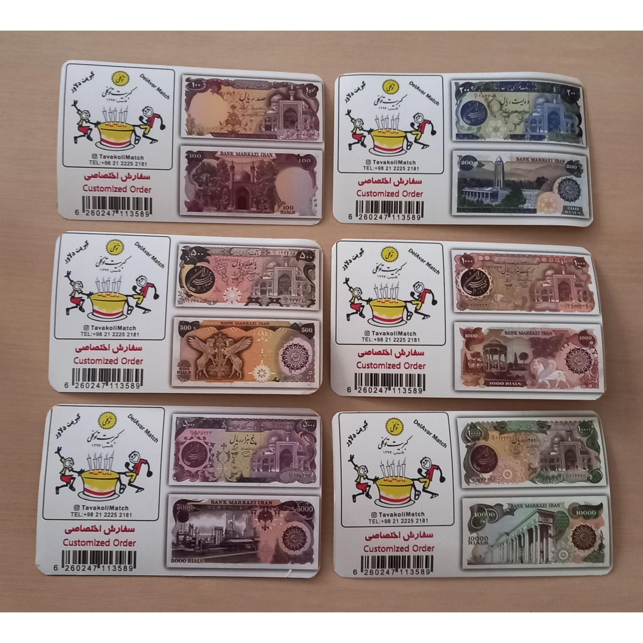 سری 6 عددی کبریت دلاور 10 سانتی با تصاویر اختصاصی اسکناسهای سری بارگاهی تولید محدود شرکت توکلی به سفار کلکسیو عاصمی میباشد.