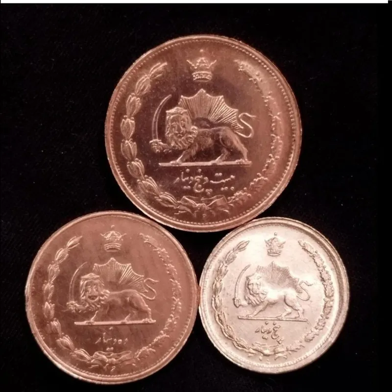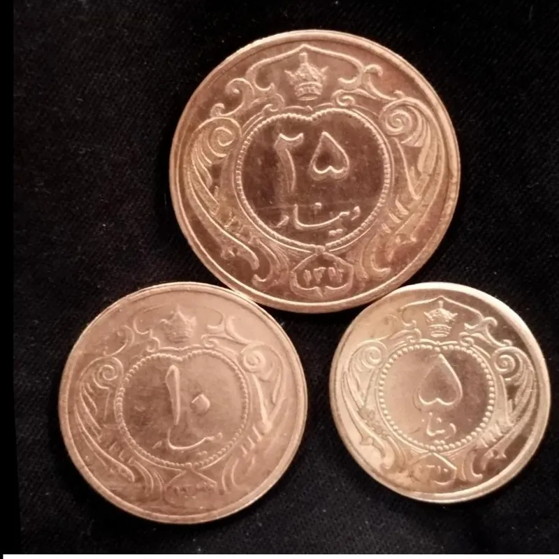 ست سکه ها شامل : 5 و 10 و 25 دیناری  مسی رضا شاه میباشد.