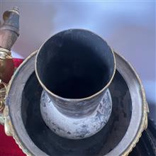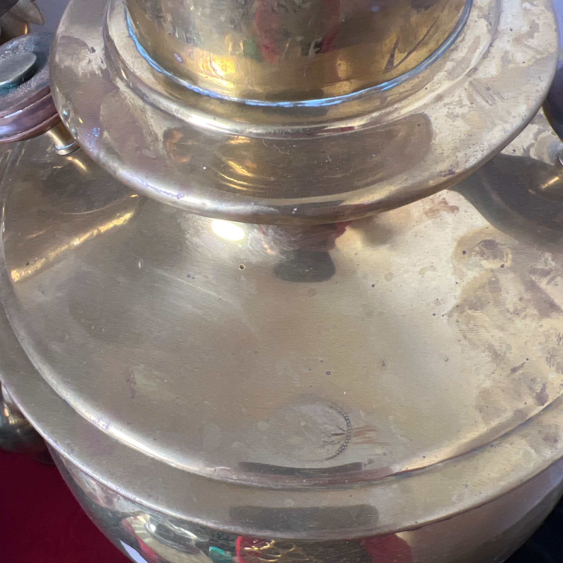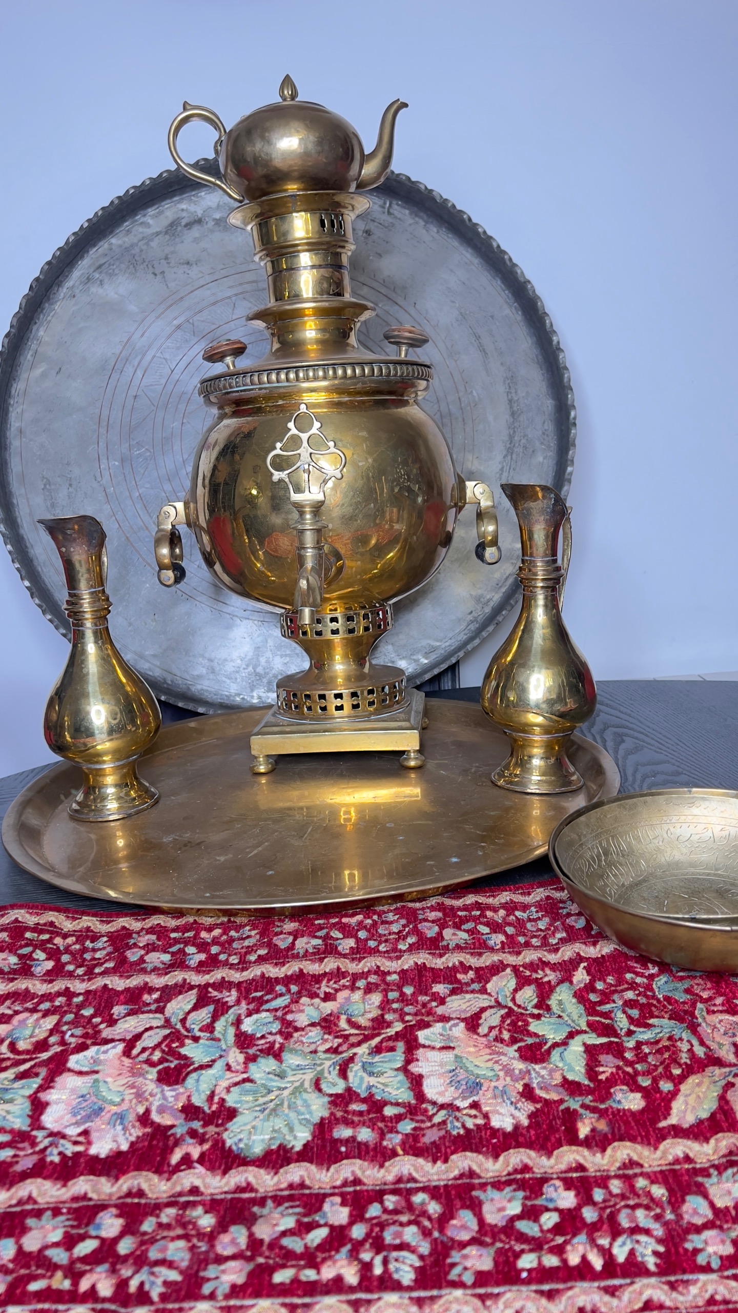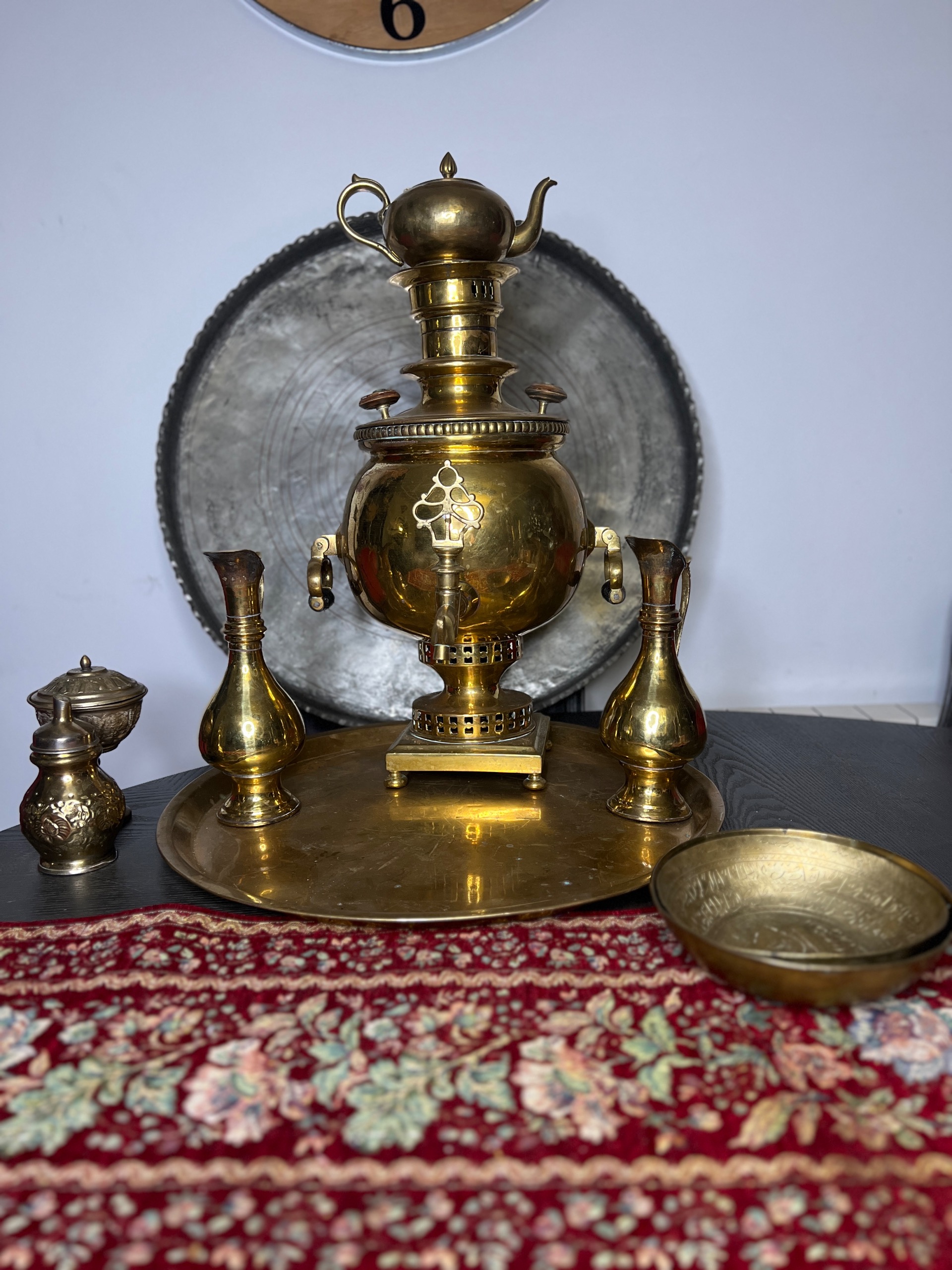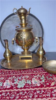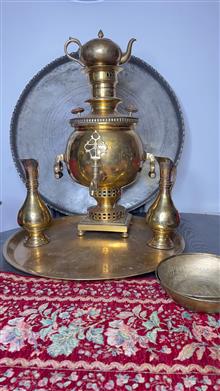سلام سماور روس مهر دار همه چیز فابریک و بکر همراه با سینی و قوری و دو عدد پارچ اردکی و کاسه و قندان و شکر ریز، سماور واقعا بکر و در حد نو میباشد