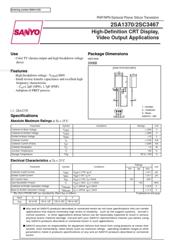 ترانزیستور 1W/hfe320 2sA1370 ساخت SANYO