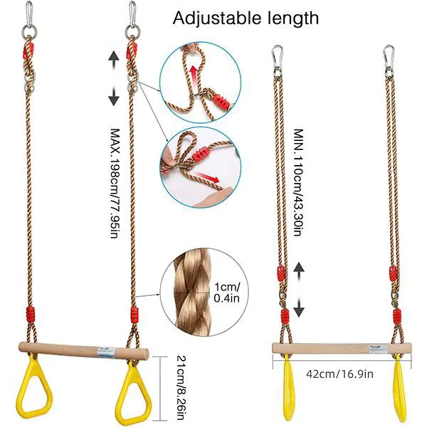 چوب قوی قابل بارگیری تا 352LB/160KG، با طناب های PP فوق العاده مقاوم در برابر سایش و محکم (تا قطر 10 میلی متر)، نوار چرخشی چوبی: طول 16.54 اینچ/42 سانتی متر و قطر 1.18 اینچ/3 سانتی متر.