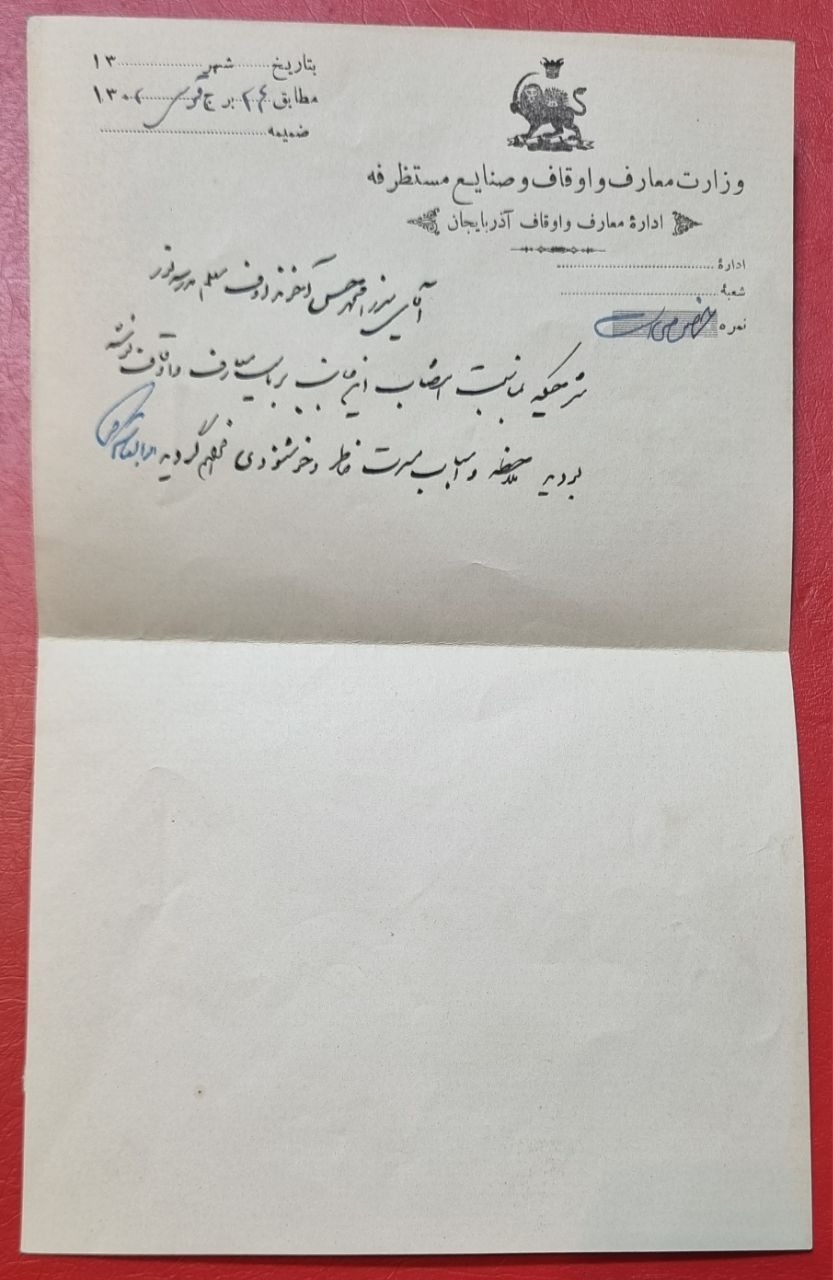 پاکت و نامه وزارت معارف و اوقاف و صنایع مستظرفه 1302 خورشیدی
