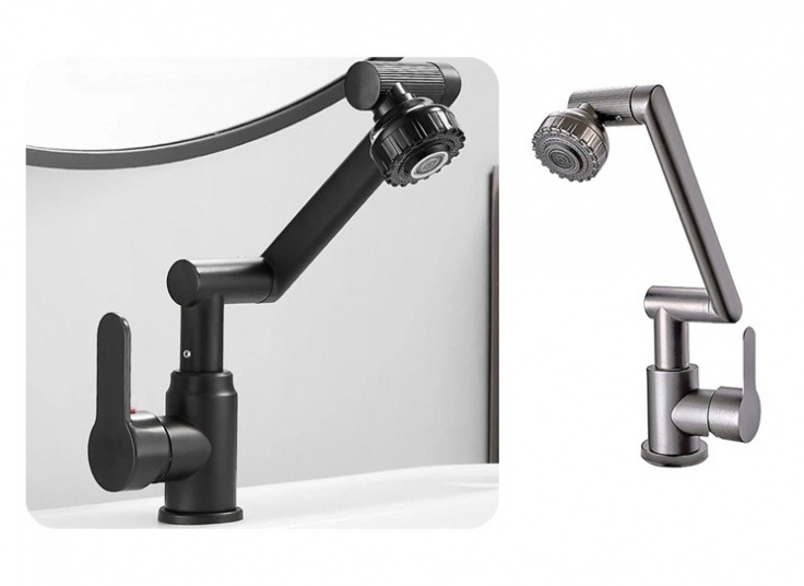 شیر آب بازویی مدل تلسکوپی است. این محصول دارای سه بازوی متحرک است که قابلیت تنظیم ارتفاع، طول علمک و زاویه آبریز دارد. تغییر این سه فاکتور در مورد شیرآلات معمولی وجود ندارد اما با این امکانات شما میتوانید دسترسی بهتری روی نقاط مختلف سینک ظرفشویی داشته باشید. شستوشوی قابلمههای بزرگ، پر کردن کتری و سماور یا تمرکز روی شستوشوی ظروف و میوهها و سبزیجات بدون پاشش آب به اطراف از مزایای این مدل طراحی است، همچنین آبریز این شیر از دو الگوی پاشش آب بهرهمند است که با اختلاط آب و هوا ضمن افزایش فشار، به صرفهجویی در مصرف آبشیر آشپزخانه