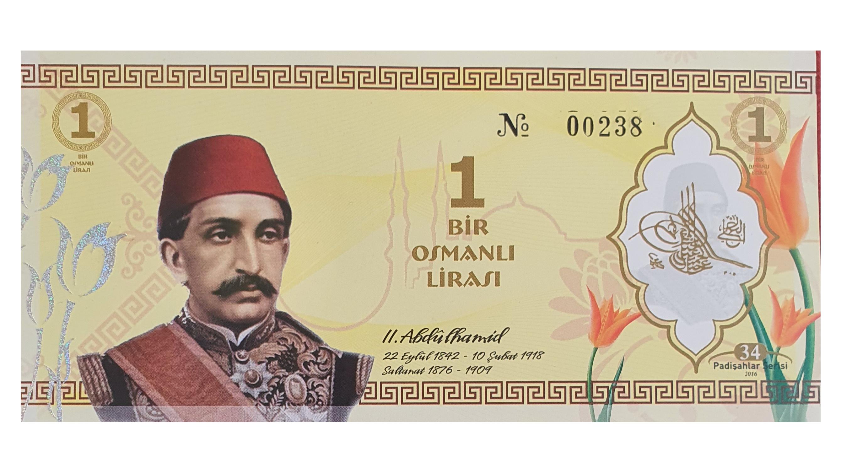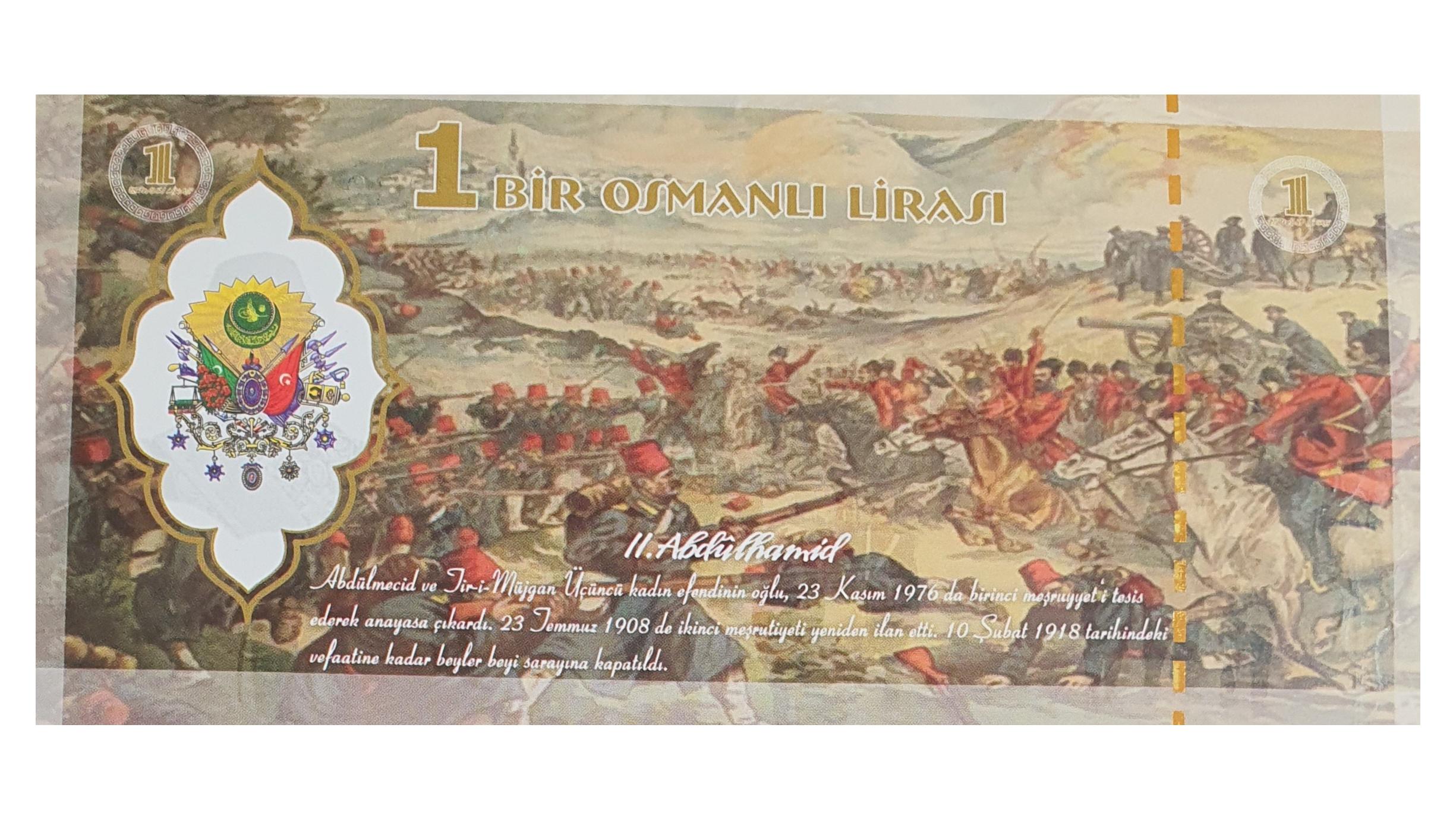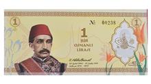 این اسکناس نایاب یادبود و کلکسیونی مدرن مربوط به امپراتوری عثمانی است و تصویر سلاطین عثمانی با طرح های امنیتی تزئینی و کیفیت چاپ براق ، رنگی مزین به نشان سلطنتی عثمانی در پشت اسکناس می باشد .
