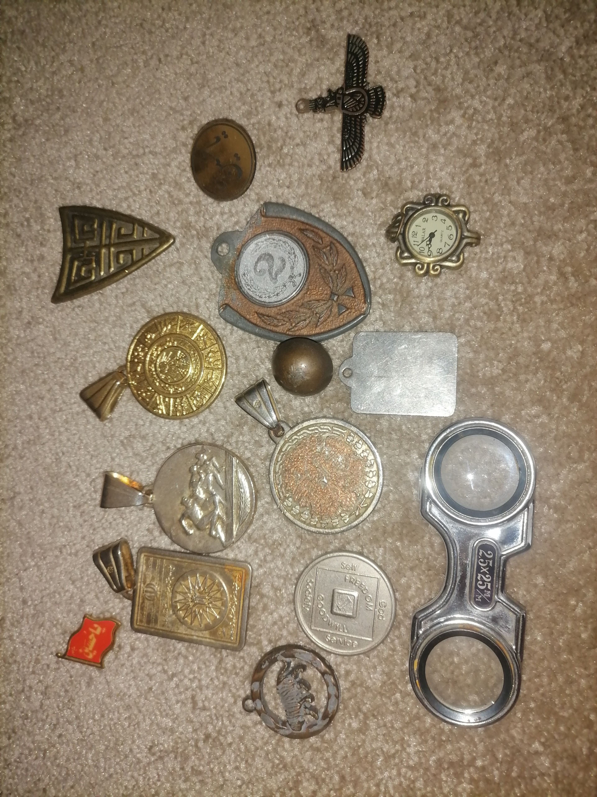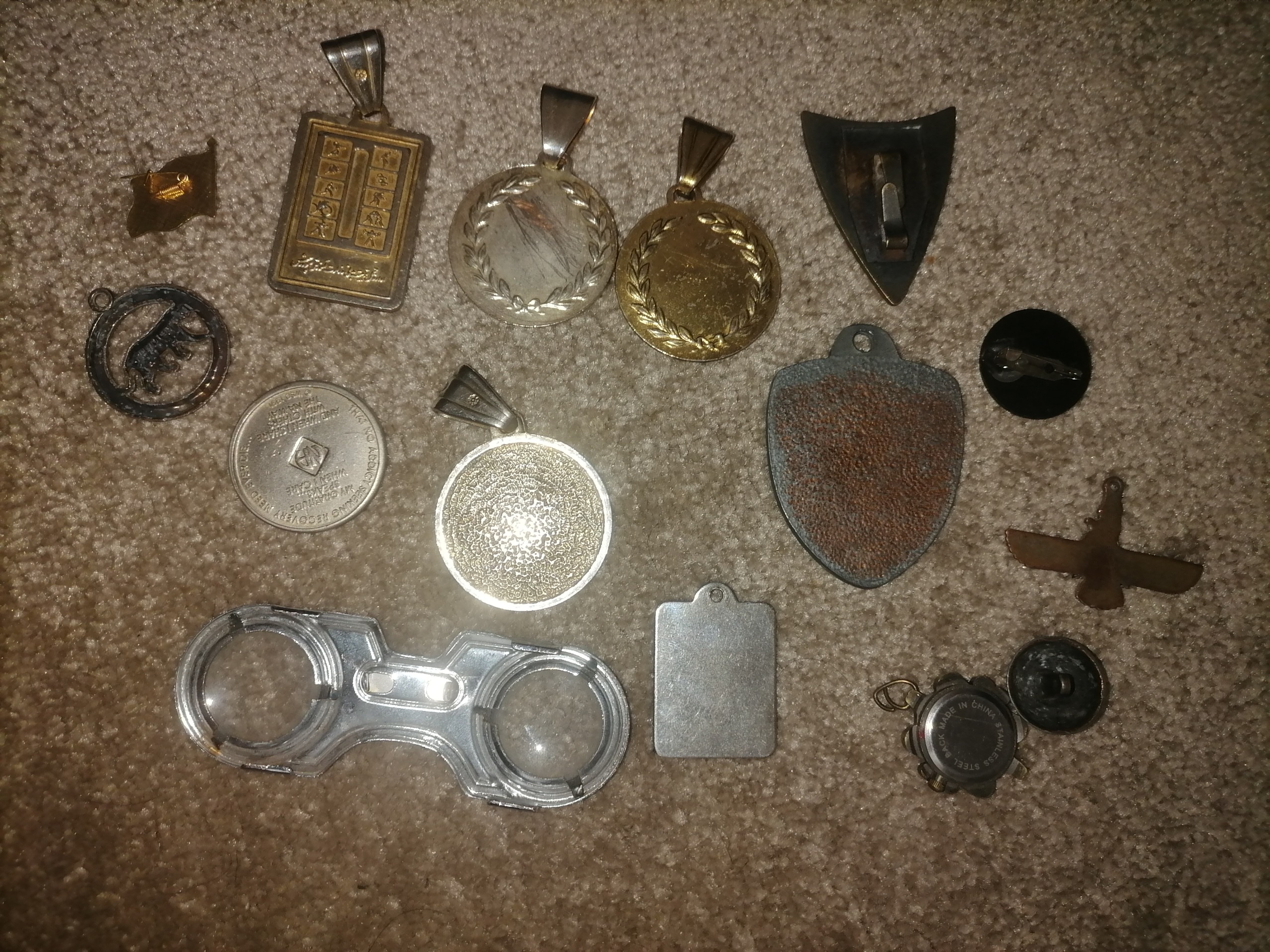 مدال و آویز فروهر و بچ و ساعت و لنز دوربین و یادبود های قدیمی و جدید و دکمه..
