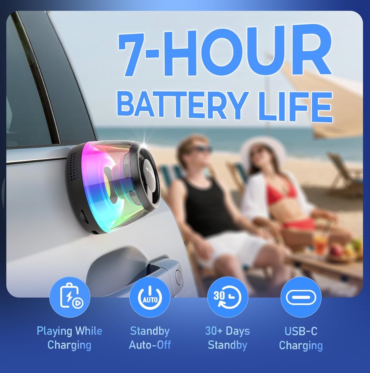 مینی و قابل حملمینی اسپیکرهای بلوتوث بیسیم، با ابعاد عمق x عرض x ارتفاع: 2.2 x 2.2 x 1.7 اینچ. وزن آن 3 اونس است. تنها دو برابر اندازه کیف Air/pods است که قرار دادن آن را در جیب یا نگه داشتن آن در دست بسیار آسان میکند. و یک بند آویز نیز همراه آن ارائه میشود که به شما امکان میدهد به راحتی آن را به کوله پشتی خود آویزان کنید. عمر باتری چشمگیراین بلندگوهای قابل حمل بلوتوث بیسیم با باتری قابل شارژ با ظرفیت بالا، تا 7 ساعت پخش با حجم صدای 70٪ را ارائه میدهند، بنابراین میتوانید بدون نگرانی از باتری از فعالیتهای فضای باز لذت ببرید. اگر در داخل خانه ویدیو تماشا میکنید، از شارژ هنگام پخش از طریق کابل USB-C (شامل) پشتیبانی میکند و لذت بیوقفه را تضمین میکند. چراغهای RGB را میتوان به صورت دستی روشن و خاموش کرد، بنابراین هیچ اتلاف برقی وجود نخواهد داشت.