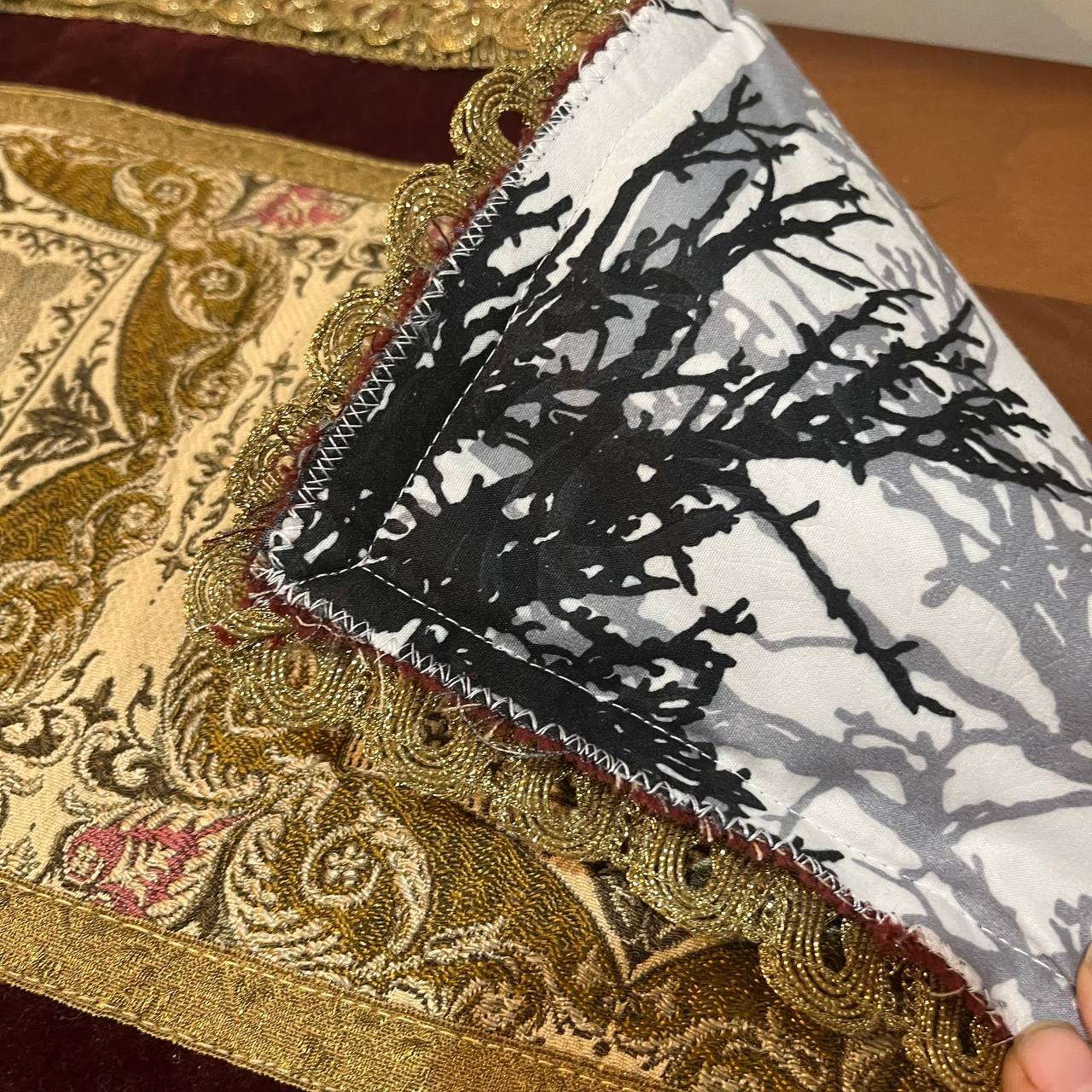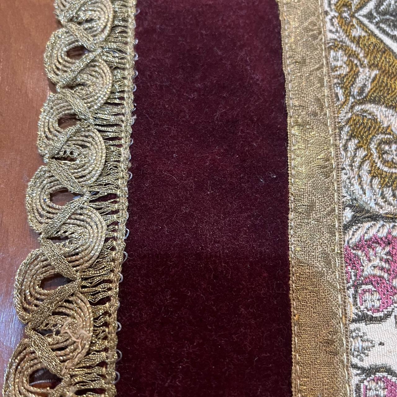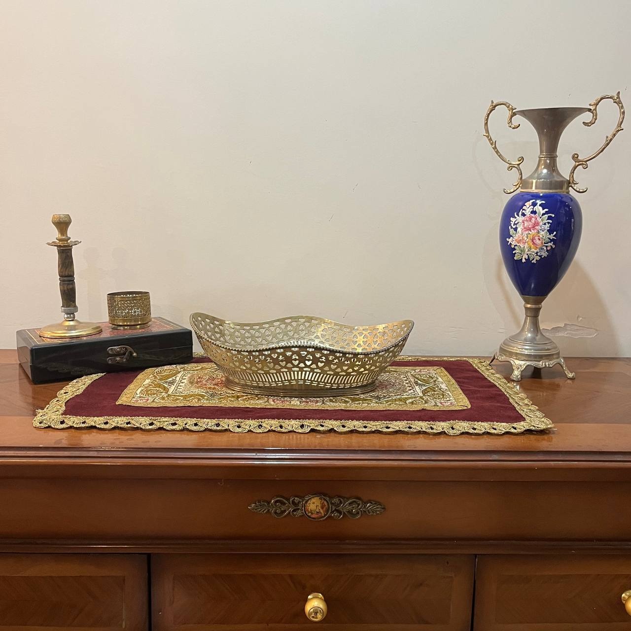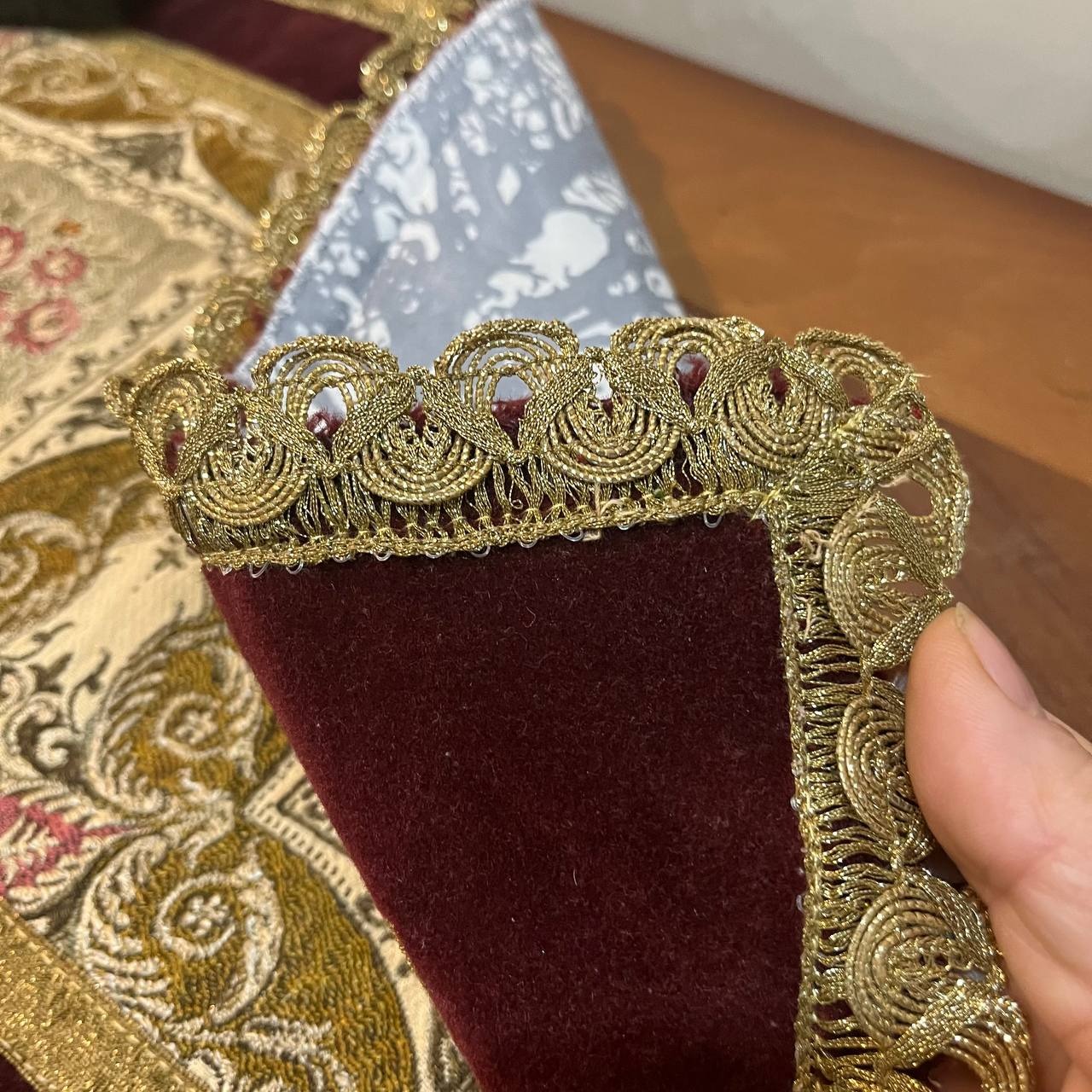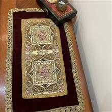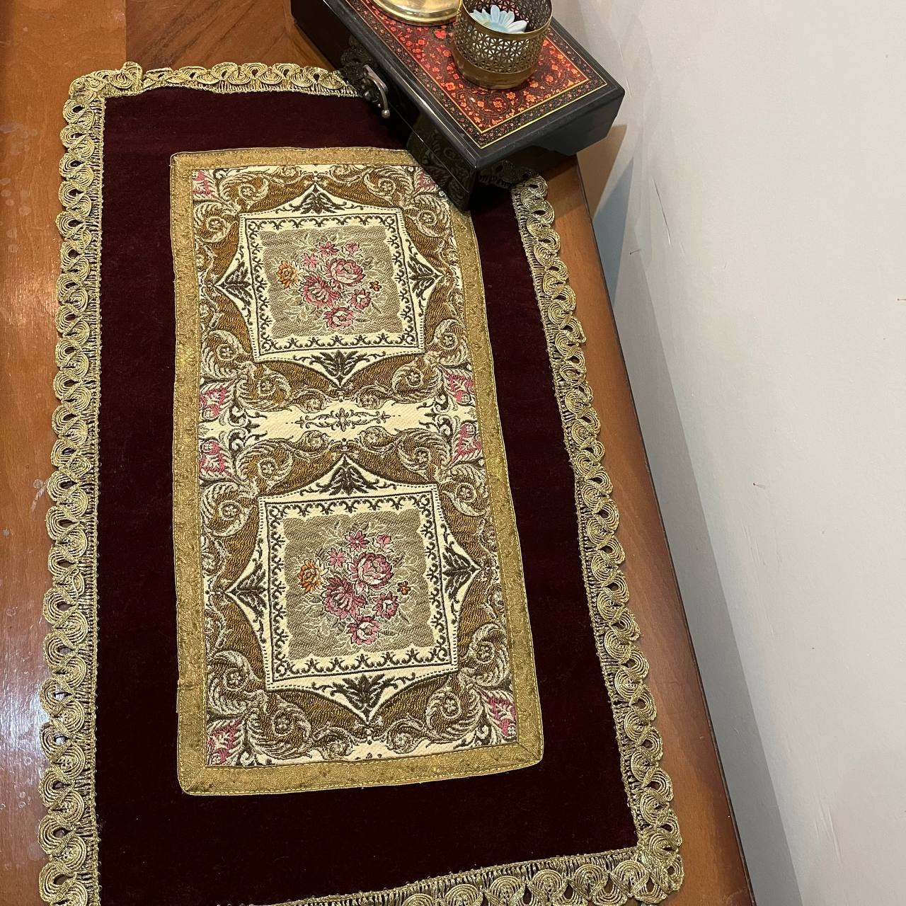 رومیزی مخمل قدیمی خارجی ترکیب مخمل و پارچه طرح دار با یراقهای طلایی یه کار چشم گیر و زیبا (مخمل ضخیم و ایستایی خوبی دارد و روی میز جمع نمی شود