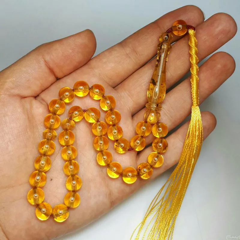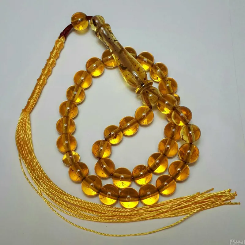 تسبیح 33 دانه کهربا طبیعی فسیلی طلایی خوشرنگ