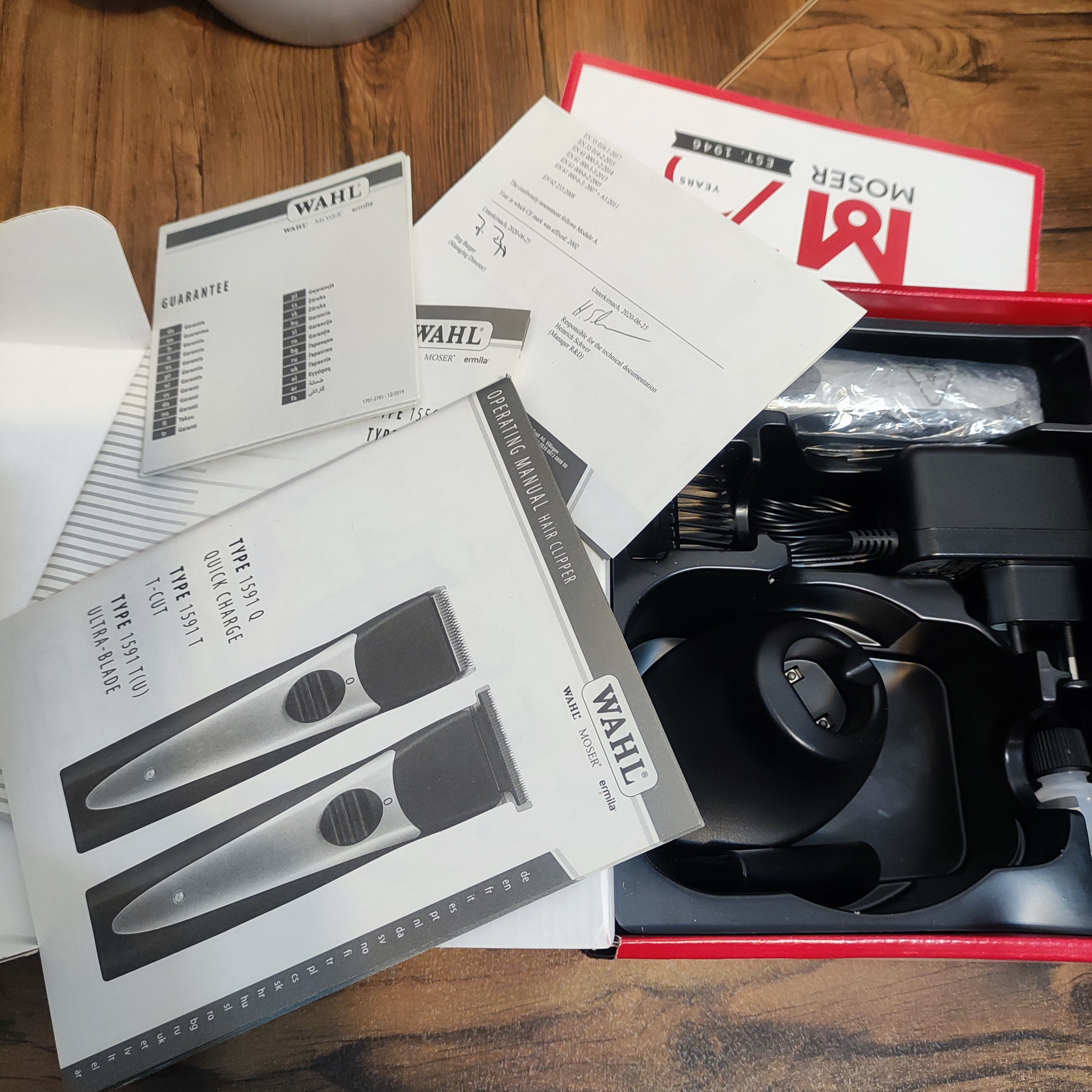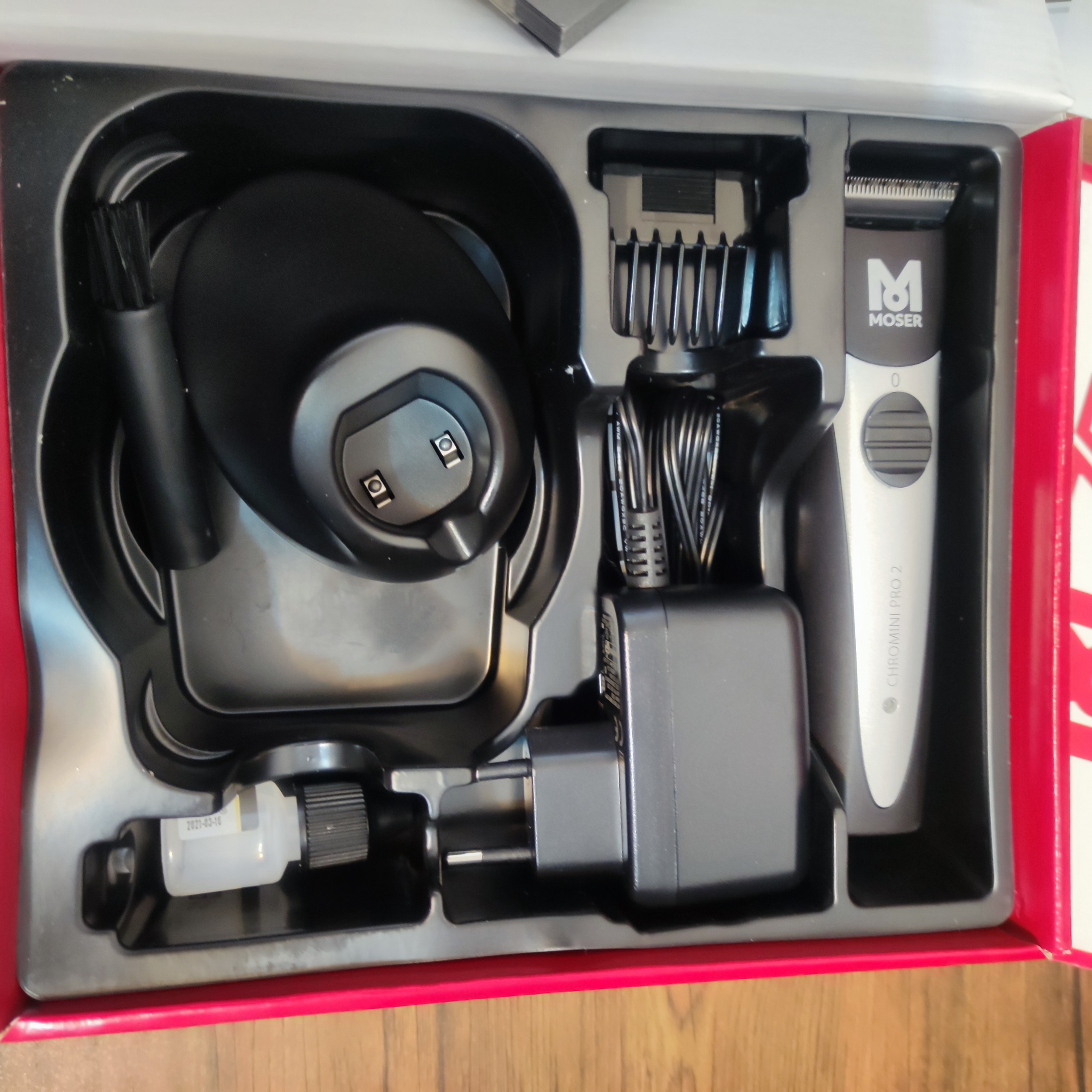 قابل شارژ و دارای جایگاه شارژ و آداپتور و برس تمیز کاری و روغن و یک شانه مجزا