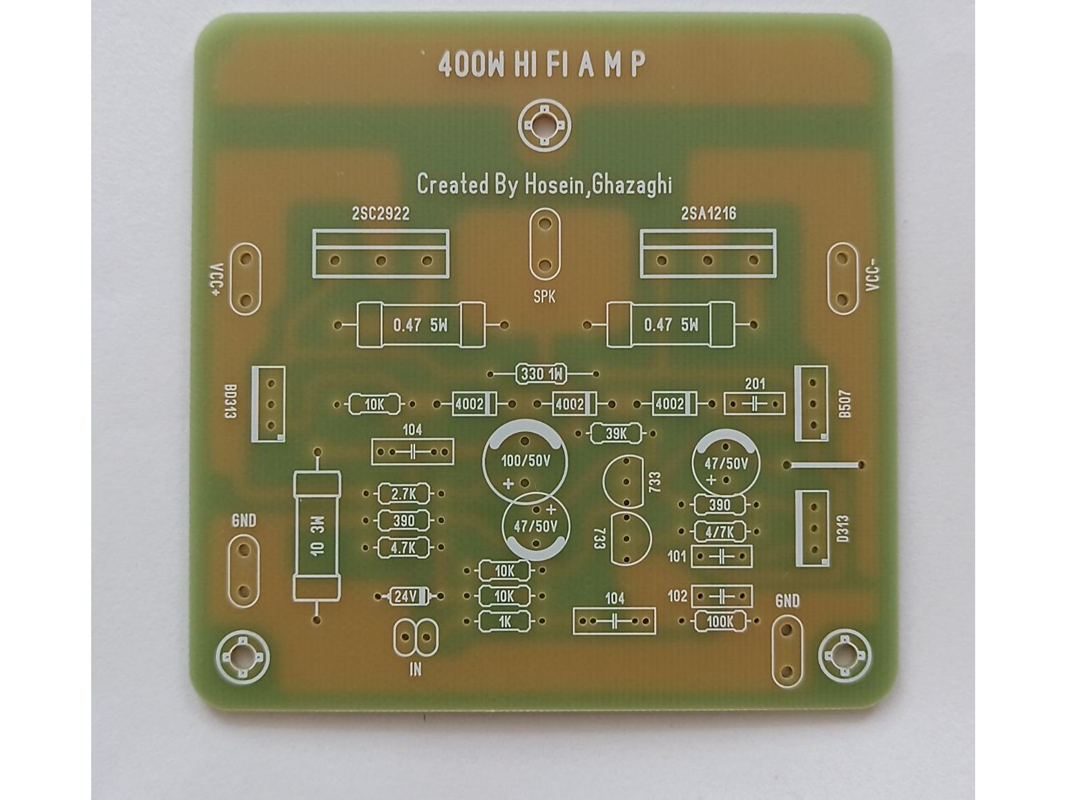 با ترانزیستورهای فوق و تغذیه دوبل 55 ولت dc و جریان 20 آمپر : خروجی 400 وات روی امپدانس 4 اهم خواهد داد و کیفیت صدای خیلی زلال و دلنشینی داره، مناسب برای بلندگو های قدرت و کیفیتی یا ساب ووفر، برای استفاده از ساب باید ورودی صدای مدار توسط کیت فیلتر پایین گذر، استفاده بشه تا خروجی صدای برد برای بیس زدن اوکی بشه