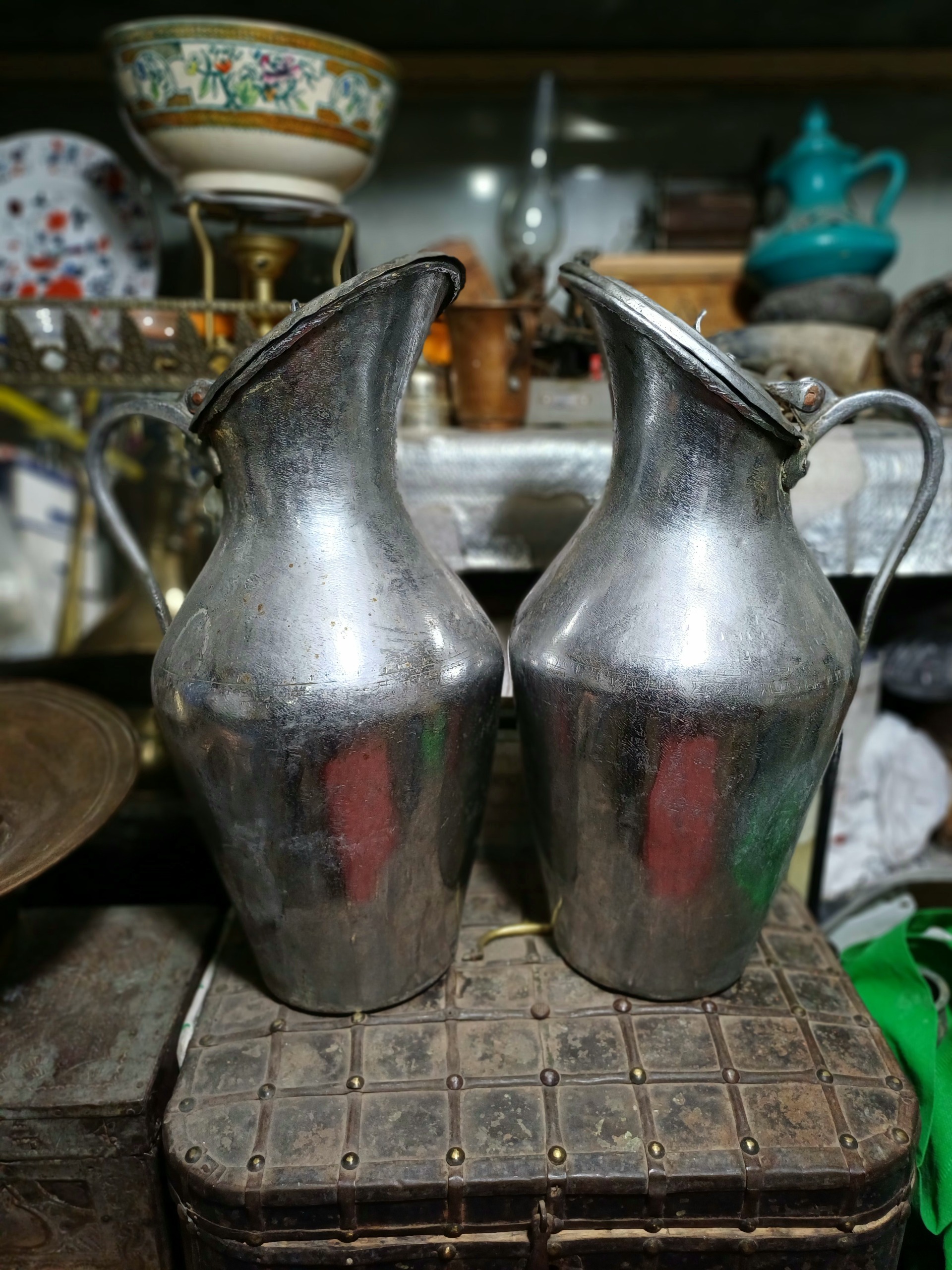 جفت پارچ مسی کهنه درب دار چکشی و کمیاب/توضیحات