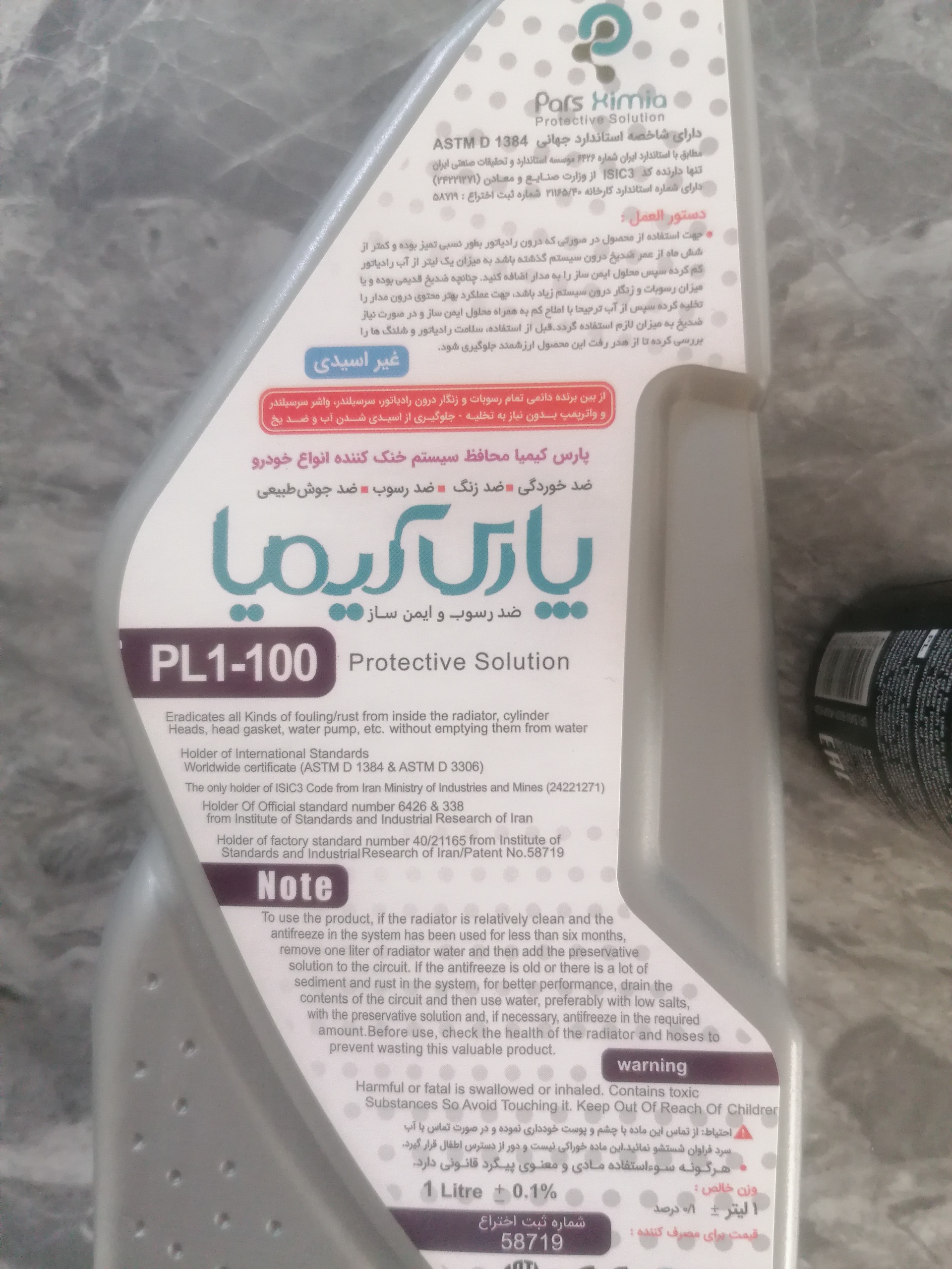 محصول بعدی محلول رادیات پارس کیمیا هست که 5 سال طول عمر مفید داره و باعث حل شدن و از بین رفتن زنگ و رسوبات ماشین میشه.
