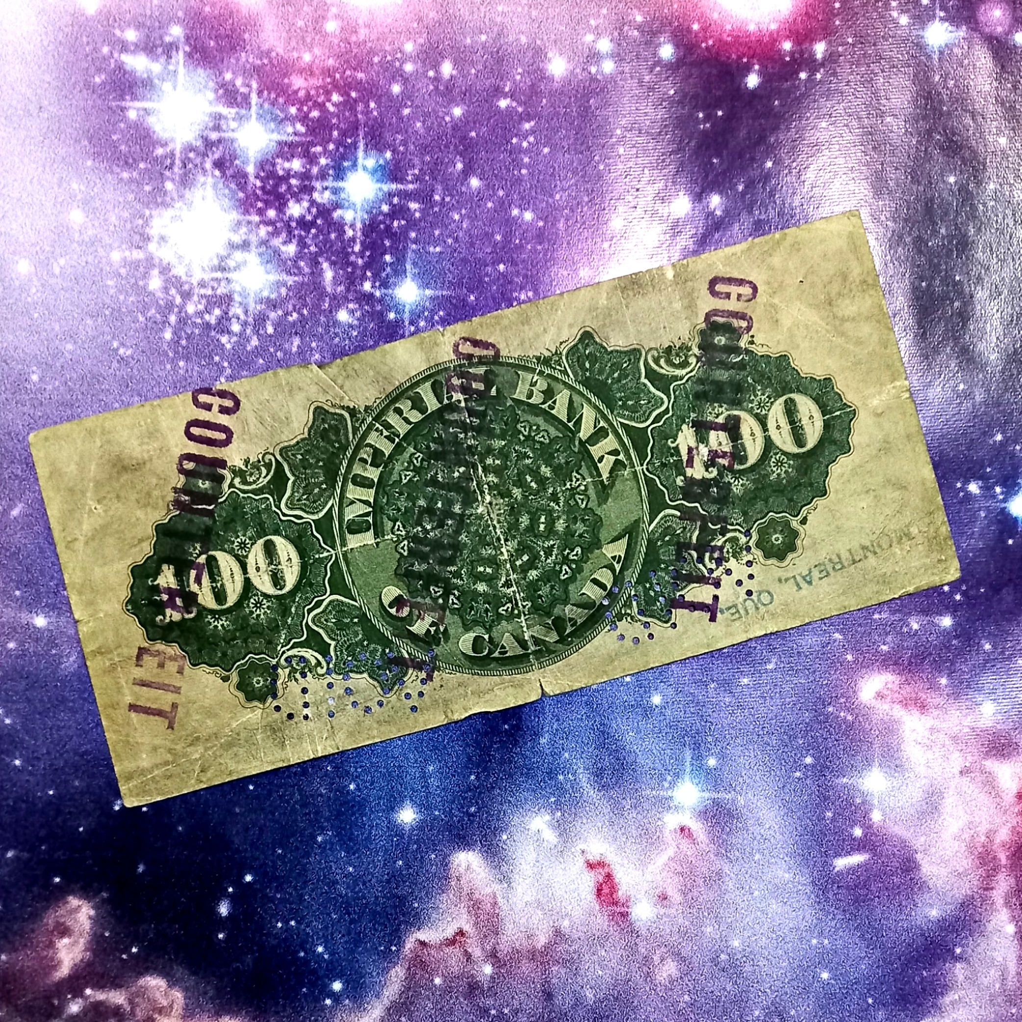 این اسکناس کمیاب که مهر جعل خورده در جنگ جهانی اول برای ضربه به کشور های متفقین توسط دولت آلمان جعل شده و توسط بانک کانادایی شناسایی شده و مهر جعل خورده وپانچ و باطل شده که همین موضوع به ارزش تاریخی وکلکسیونی آن می افزاید