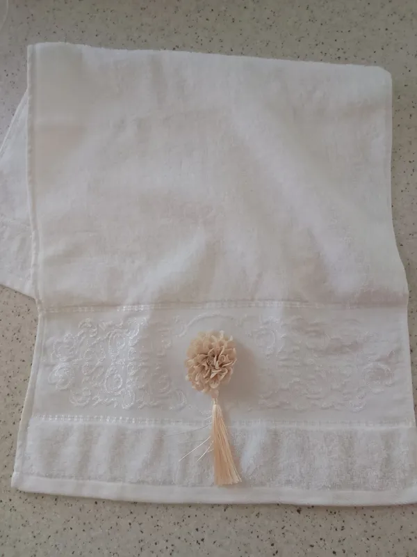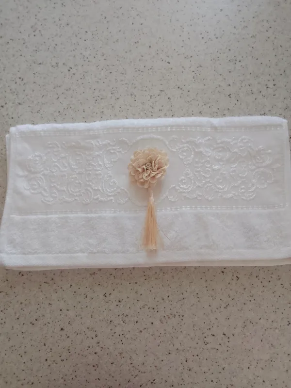 حوله دستی سفید کرم شیری نگین دار گل برجسته عروس