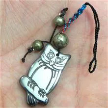 گردنبند آویز از سنگ حدید صینی با تراش و حکاکی طرح جغد همراه بند بافته و ساخته شده از نخ ابریشمی و مروارید