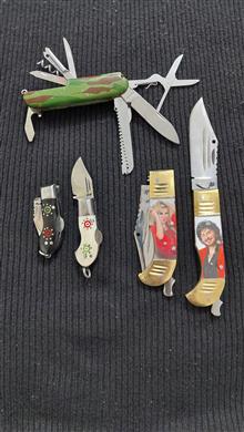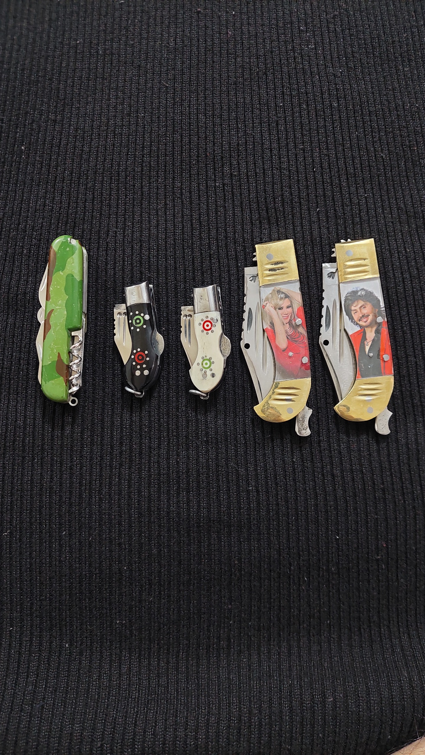 8عدد انواع چاقو 2 عدد طرح بابا سایز کوچیک 2 عدد 6دنده 2 عدد چند کاره سویسی و 2 عدد شکاری دست ساز مطابق عکس
