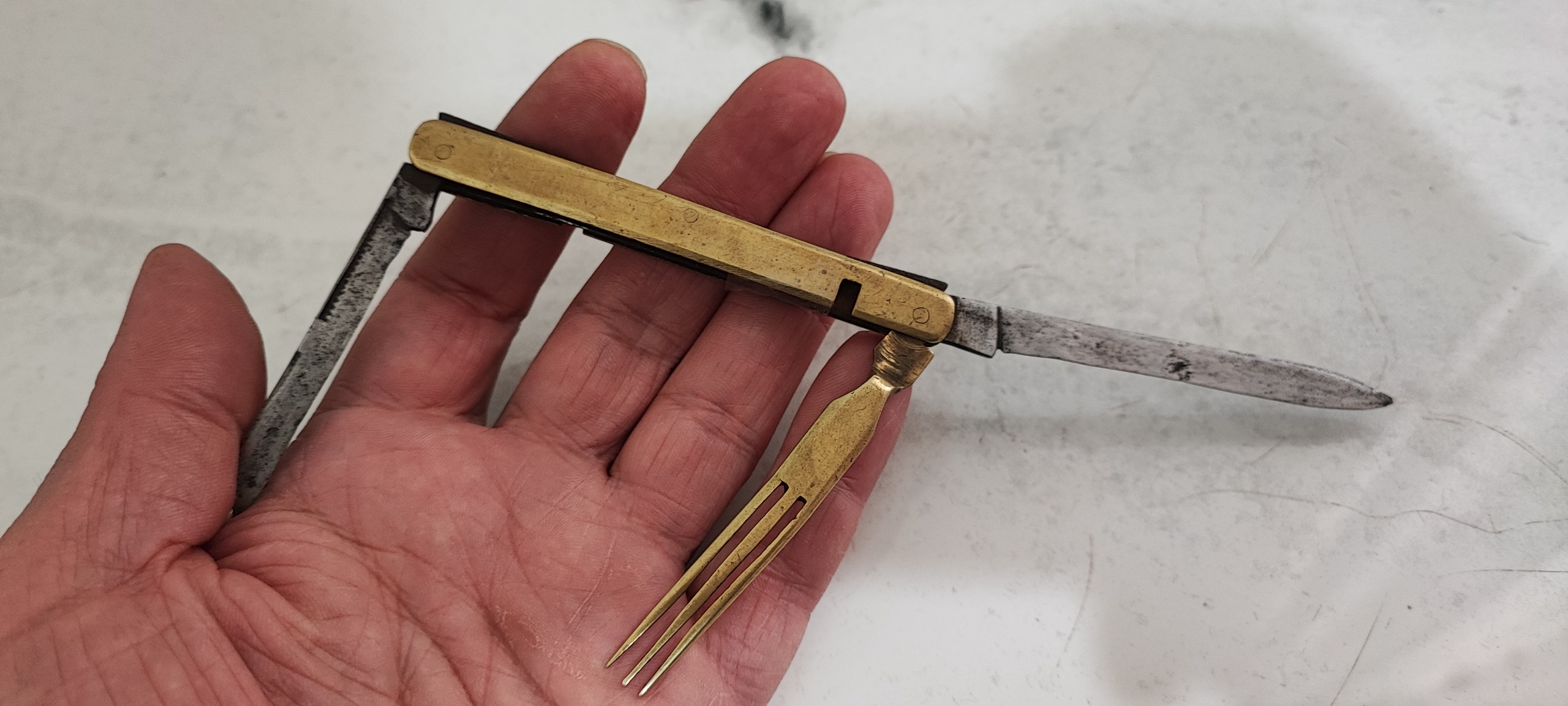 17 سانت طول، دسته برنج و تیغه ها فولادی، کیفیت کارکرده و مطاق تصاویر و بنظرم یک قاشق هم در دسته بوده که کنده شده، نایاب و زیبا و کلکسیونی